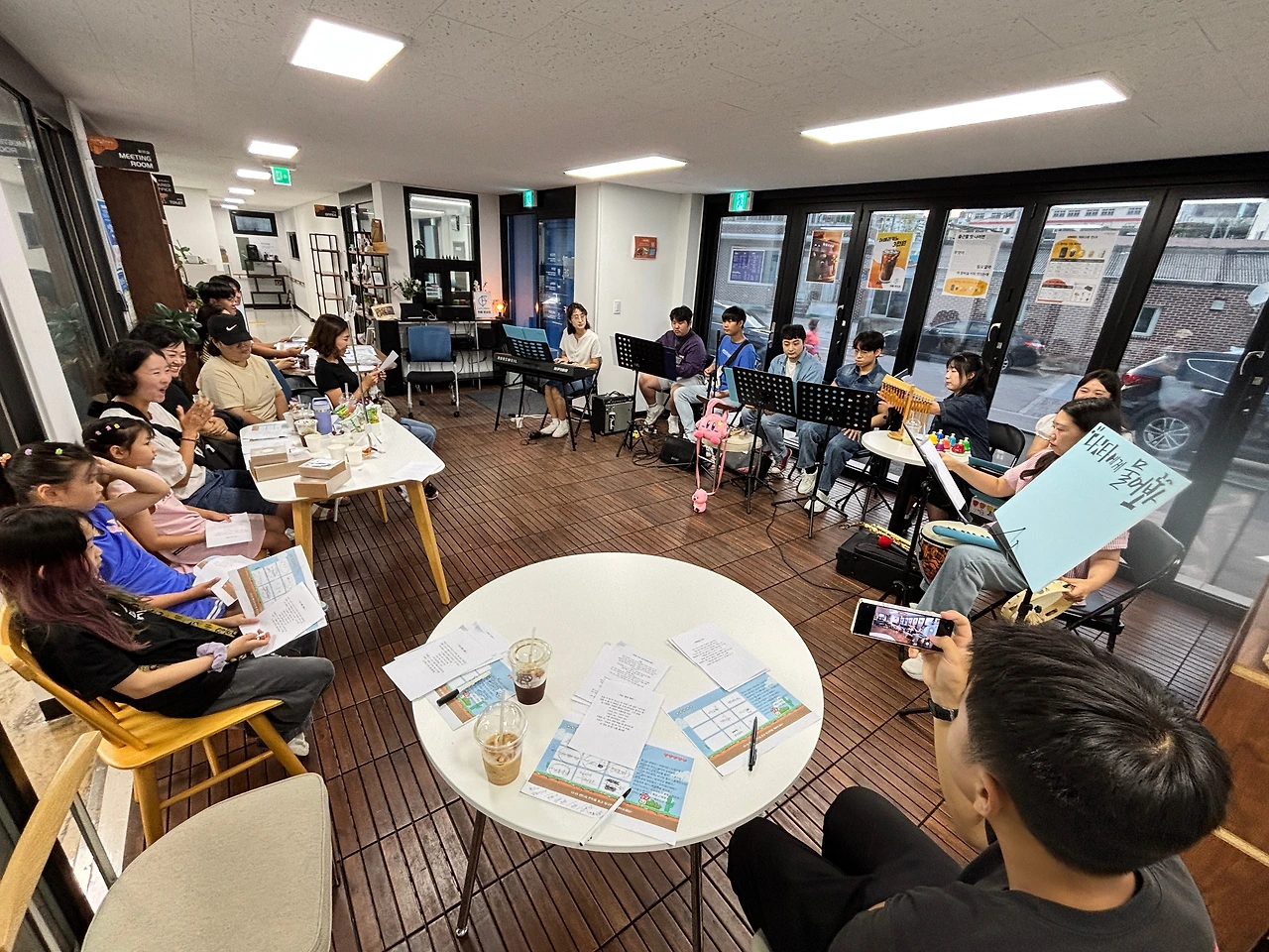 동해청춘음악대 ‘다·타’가 세대 간 공동체 회복과 음악을 통한 문화공론의 장을 위해 마련한 추억의 만화 OST 버스킹 공연이 26일 오후 6시, 동해 부곡동에 위치한 가치성장타운 1층 카페 온오프에서 열렸다.