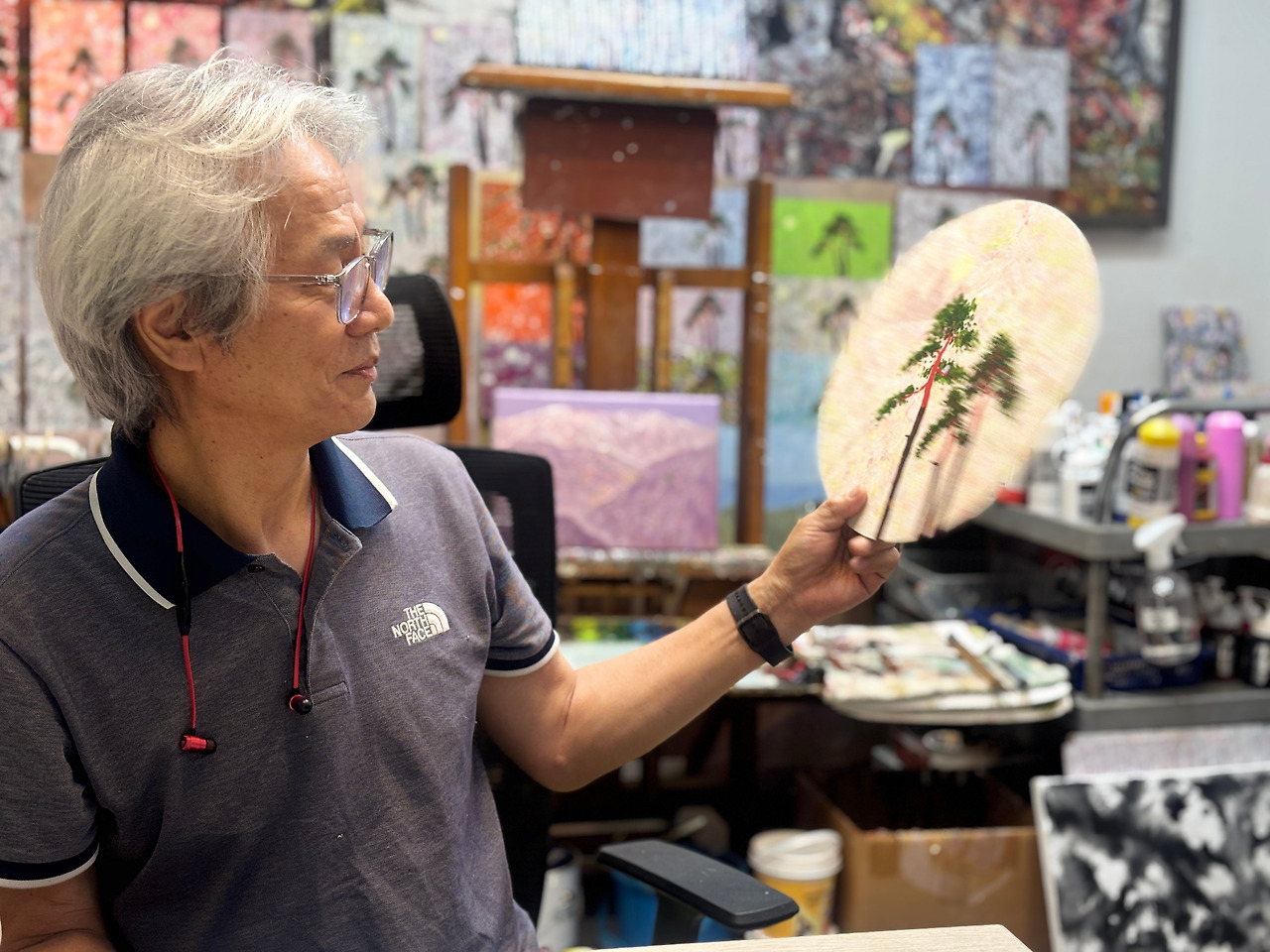 김 화백은 오래된 음반에 붓을 대어 풍경을 피워 올린다. 소리를 담던 검은 음반 위로 소나무가 자라나고, 바람이 스며들며, 노래 대신 색채의 울림이 번져나간다. 음악의 시간은 그림의 공간으로 변주되고, 낡은 매체는 예술의 캔버스로 다시 태어난다.