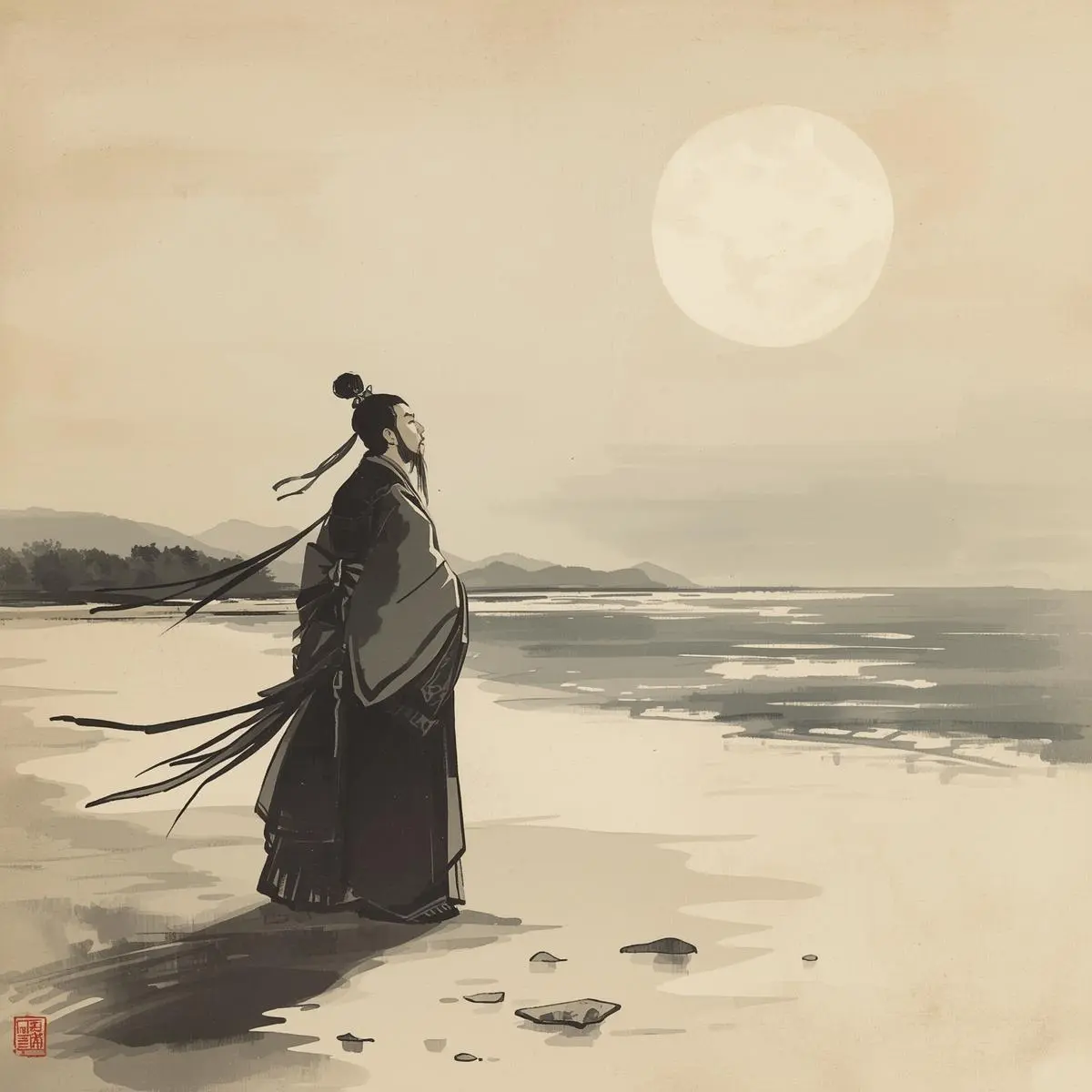 여기서 ‘仙娥(선아)’는 달의 선녀 항아를 가리킨다. 정철은 소복을 항아에 비유하며 이상적 존재로 그려낸다. 그러나 ‘碧雲迷海(벽운미해)’라 한 대목에서 이미 길은 끊어지고 소식은 멀어졌다. 마지막 구절 ‘錯使行人也斷腸(착사행인야단장)’은 길이 어긋난 탓에 나그네의 창자가 끊어진다는, 곧 이별의 고통을 절절히 토로한다.