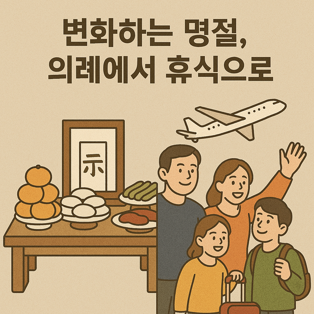 이제 명절은 더 이상 “의무의 시간”이라기보다 “휴식과 선택의 시간”으로 바뀌어 가고 있다. ‘차례 대신 여행’은 이미 하나의 새로운 관습처럼 자리 잡았다. 가족 단위로 근교로 떠나거나, 아예 해외로 휴가를 나가는 경우도 적지 않다. 명절을 ‘쉼’과 ‘재충전’의 기회로 인식하는 젊은 세대의 태도가 부모 세대에게도 영향을 주면서, ‘온 가족이 함께 떠나는 명절 여행’은 자연스러운 풍경이 되었다.