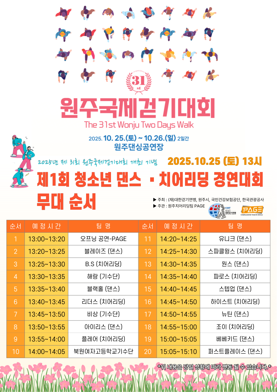 이번 대회는 대한 걷기 연맹, 원주시, 국민건강보험공단, 한국관광공사가 공동 주최하고, 원주시 치어리딩팀 PAGE가 주관했다. 걷기 문화를 기반으로 청소년의 건강한 신체활동과 공동체 예술로서의 치어리딩 문화를 확산시키기 위해 마련된 행사로, 청소년 문화예술의 저변을 넓히는 의미 있는 자리였다.