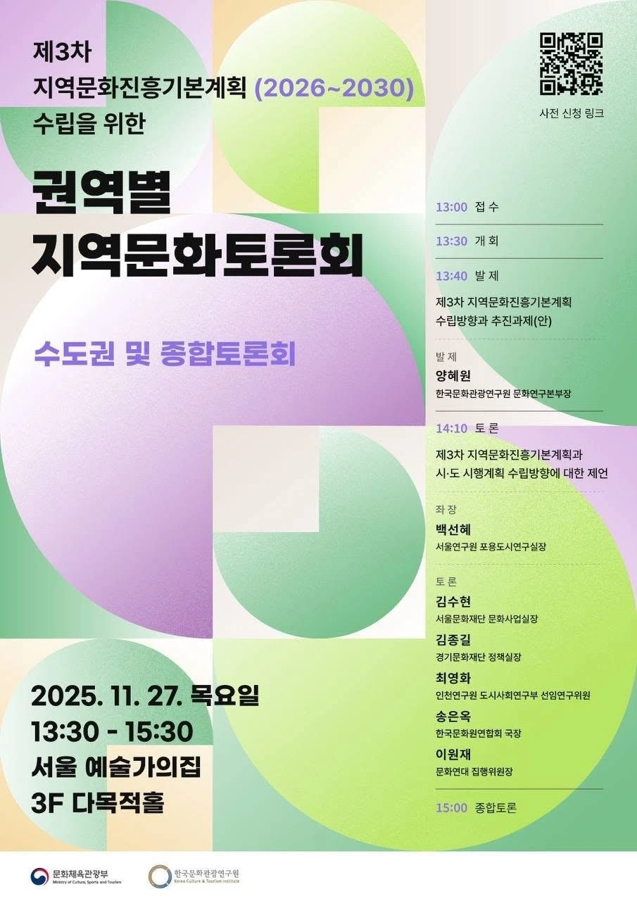 한국문화관광연구원은 지난 11. 19일부터 21일까지 전라·제주권, 강원·충청권, 경상권에서 제3차 지역문화진흥기본계획 수립을 위한 권역별 토론회를 개최했다. 지역문화진흥법에 따라 5년마다 수립되는 이 기본계획은 지역 간 문화격차 해소와 지역별 특색 있는 문화 발전을 목표로 한다.