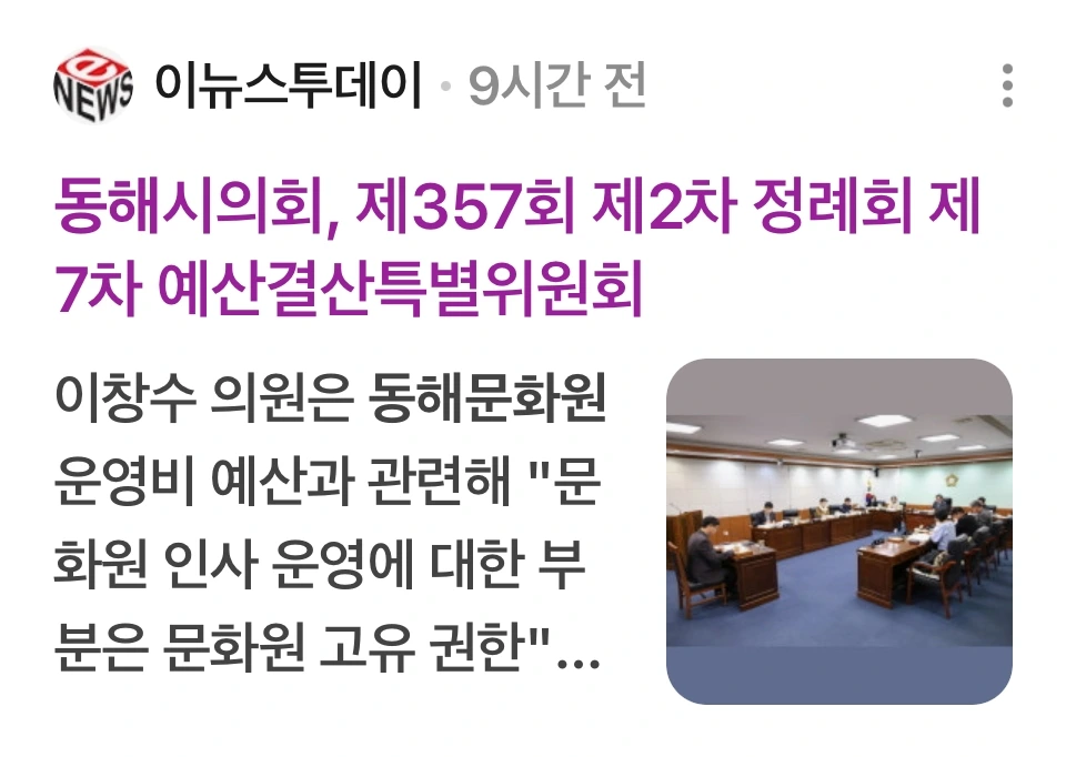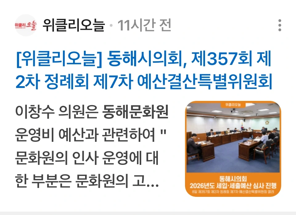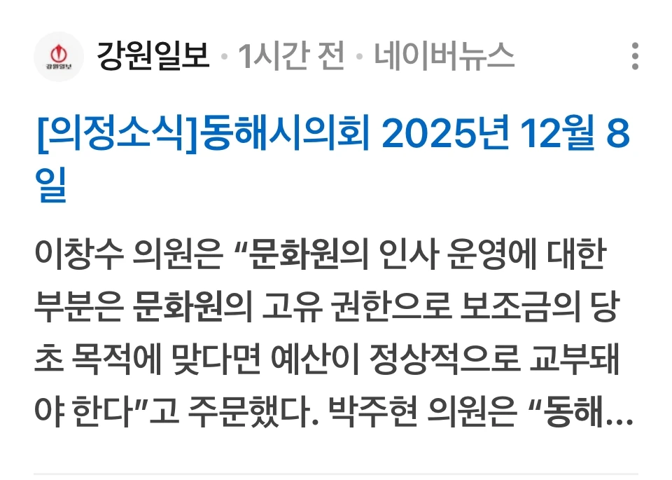 이창수 의원은 동해문화원 운영비 예산과 관련하여 “문화원의 인사 운영에 대한 부분은 문화원의 고유 권한"이라고 강조하며, "보조금의 당초 목적에 맞다면 예산이 정상적으로 교부되어야 할 것”이라고 말했다.