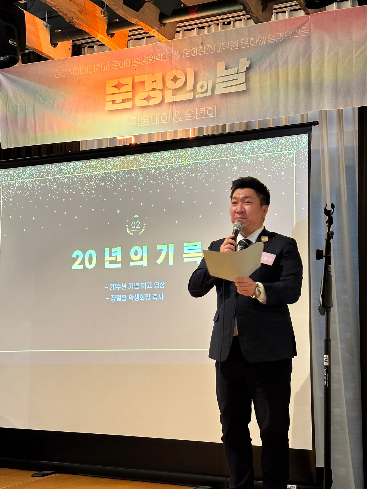 진행은 연극배우이자 필자와 2025년 대학원 원우회를 이끌었던 하형래 원우가 담당했다. 최강 열정 강윤주 전공 지도교수의 개회사로 시작된 2026년 문경인의 날 행사는 20주년 기념 아카이브 영상 상영, 학부와 대학원 교수진 소개, 총학생회장 축사, 재학생 및 동문 근황 공유, 축하 공연 및 레크리에이션 순으로 밀도 있게 진행됐다.