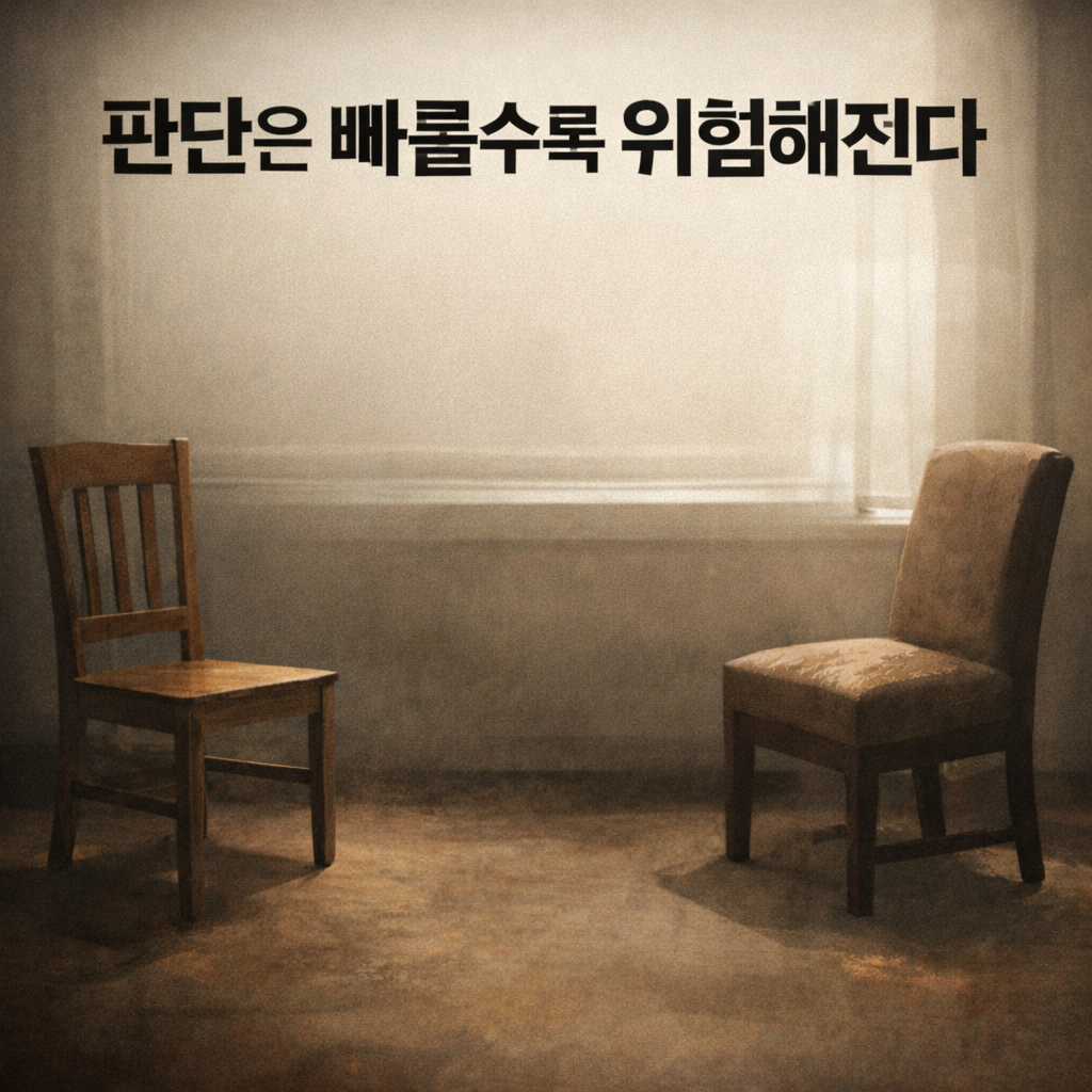 사안의 양쪽 끝이 아직 닿지 않은 상태, 사실과 해석이 서로를 밀어내며 부유하는 국면에서 내려진 평가는 대부분 정확하지 않다. 그것은 진실에 근접한 판단이기보다, 불안에 대한 조급한 반응에 가깝다. 특히 제도, 법, 절차, 관계가 얽힌 문제일수록 한 사람의 말이나 단면적 정보만으로 상대를 규정하는 순간, 판단은 쉽게 오만으로 기울어진다.