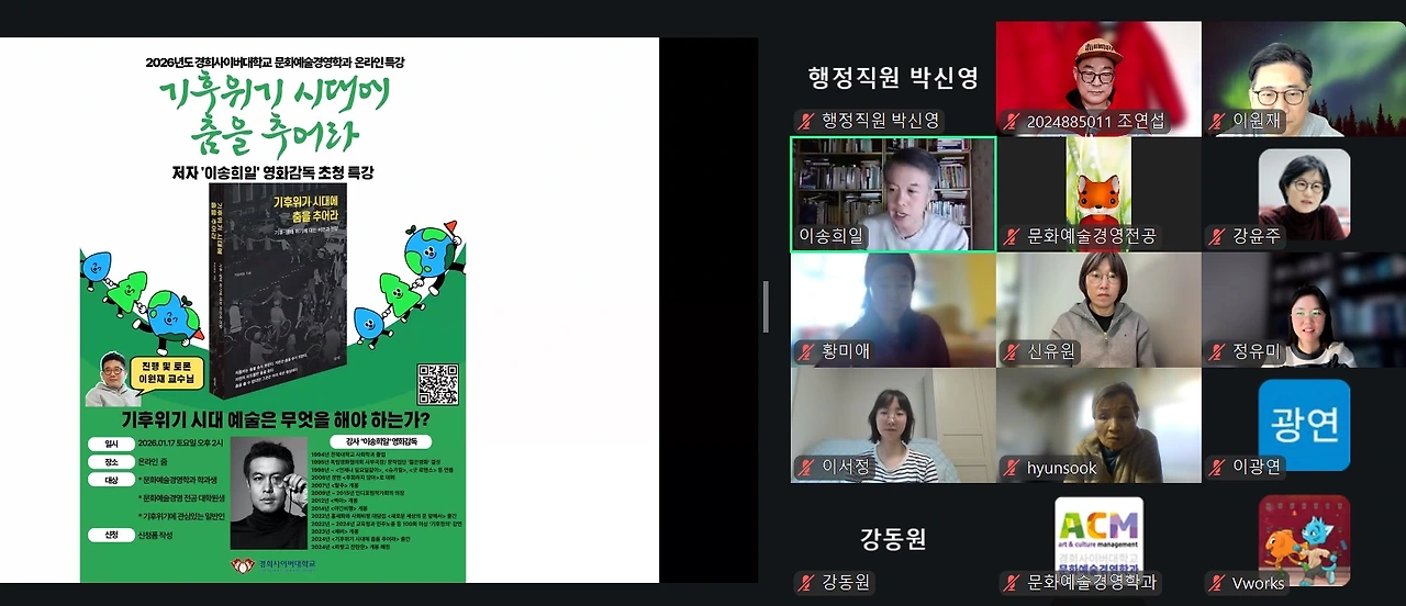 지난 1월 17일, 경희사이버대학교 학부와 대학원 문화예술경영전공이 마련한 2026년 온라인 시리즈 특강 “기후위기 시대에 춤을 추어라”에서 이송희일 영화감독은 통념을 깨는 날 선 화두를 던졌다.