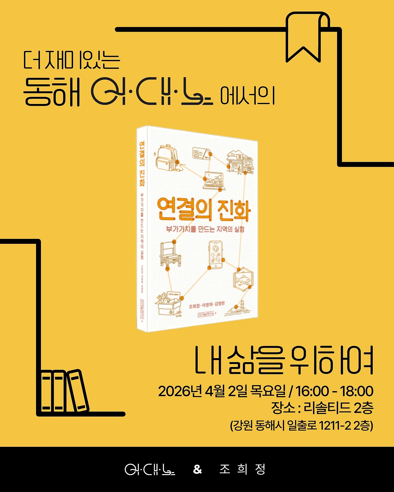 북토크 이후에는 ‘더 재미있는 동해 어대노에서의 내 삶’을 주제로 참가자들이 자유롭게 이야기를 나누는 오픈 토크 시간도 마련된다. 지역에서 살아가는 삶의 방식과 공동체의 미래를 함께 상상하며 편안한 대화를 나누는 시간이다.
