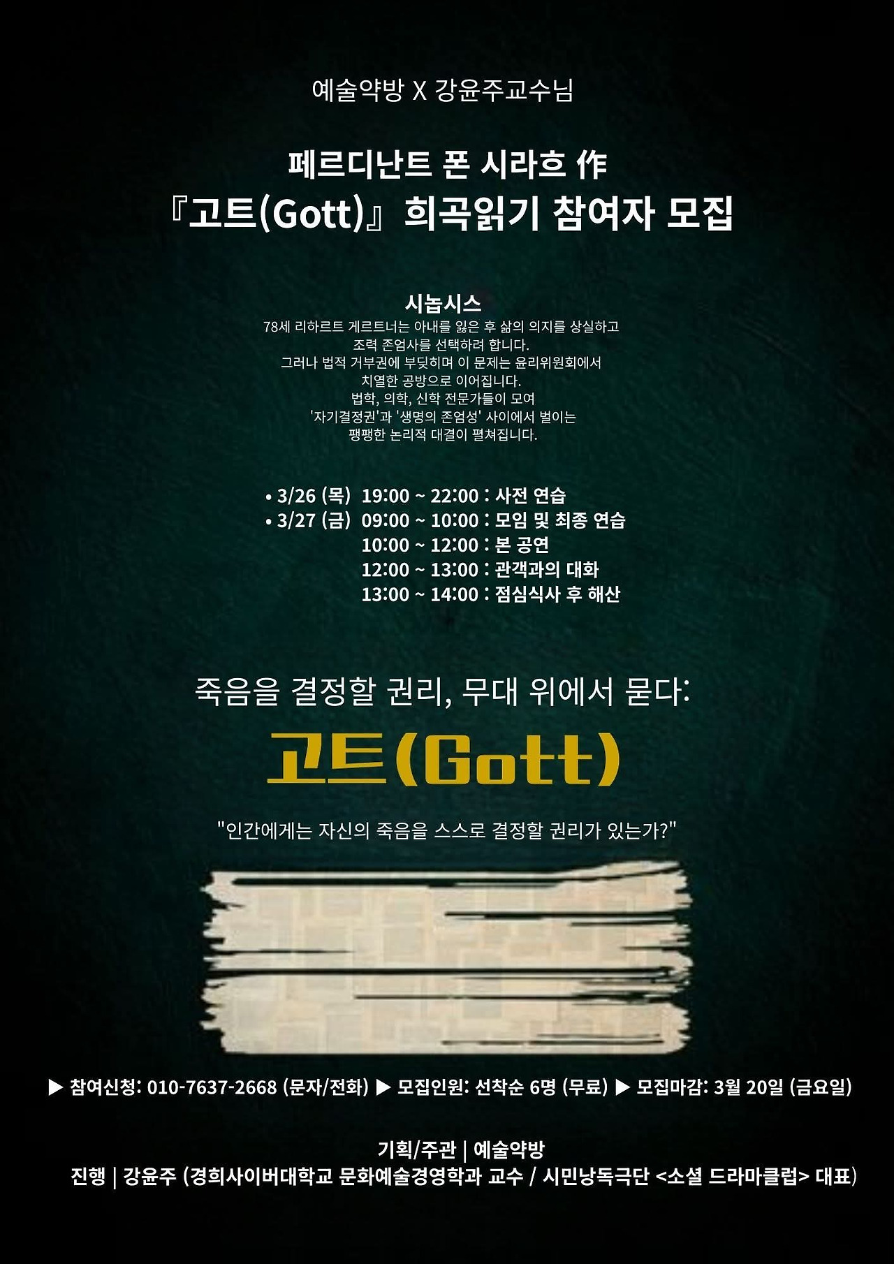 이번 무대에 오르는 희곡 <고트>는 존엄사와 인간의 자기 결정권을 둘러싼 논쟁을 '공청회' 형식으로 풀어낸 작품이다. 의학, 종교, 법률, 철학 등 다양한 관점이 팽팽하게 교차하는 구조 속에서 참가자들은 직접 배역을 나눠 맡아 텍스트 속으로 뛰어든다. 이 과정을 통해 참가자들은 서로의 관점을 나누고, 추상적인 '죽음'의 문제를 구체적인 '사회적 논의'로 확장하게 된다.