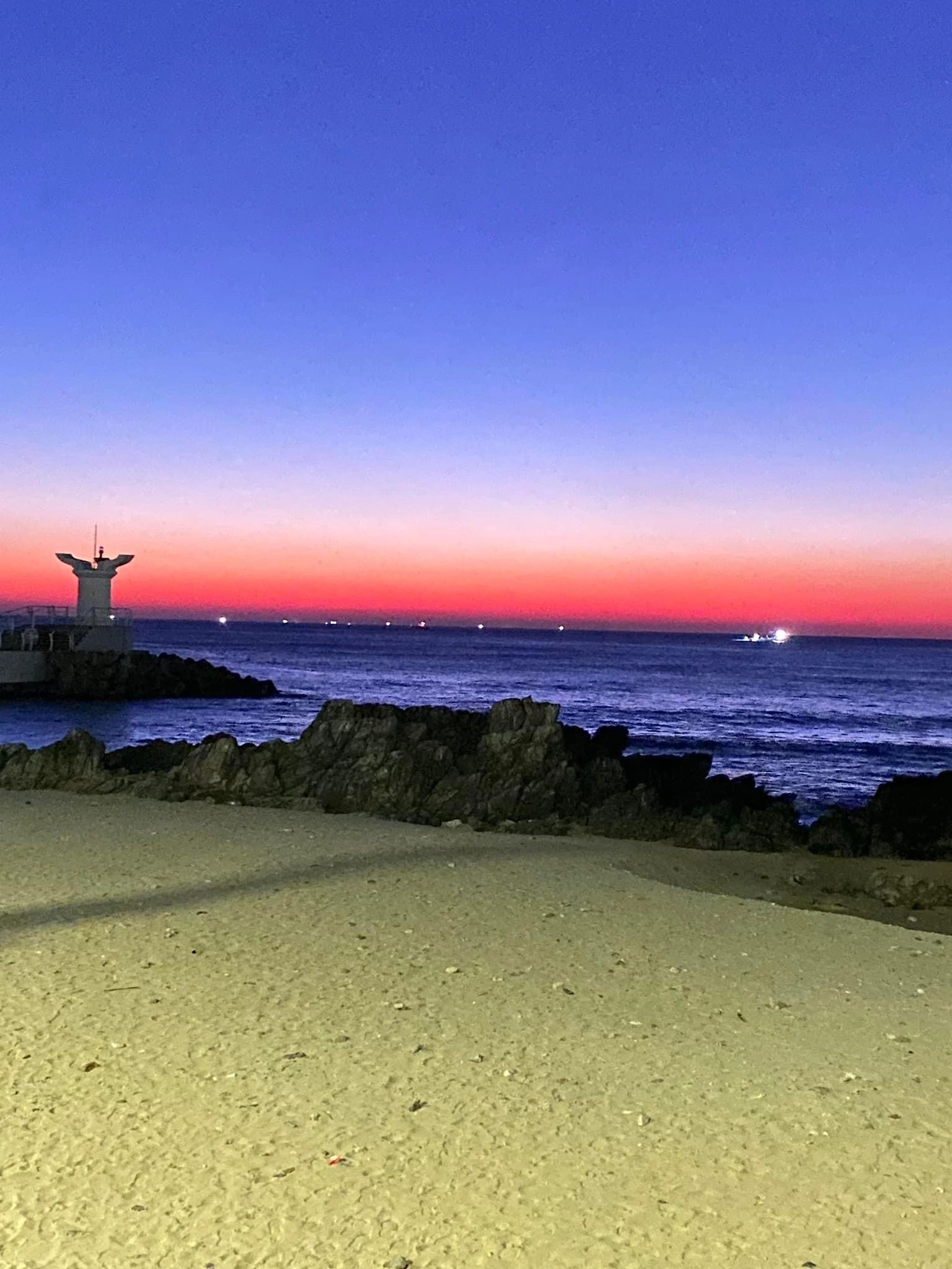 Q. 이 색은 동해에만 있는 색이죠? A. 네 아닙니다. 아침 산책시간 곳곳에서 가끔 만나는 순간입니다. ‘동해만 있는 색이다.‘라고 단정 짓기는 어렵습니다. 나타났다 사라졌다를 반복하는 동해 여명과 일출의 유혹은 워낙 다양하고 독특한 색감을 보이고 있어 장담하기 힘들다. 정답은 <찰나>의 장면을 만나는 시간이 정답이며 장소입니다.