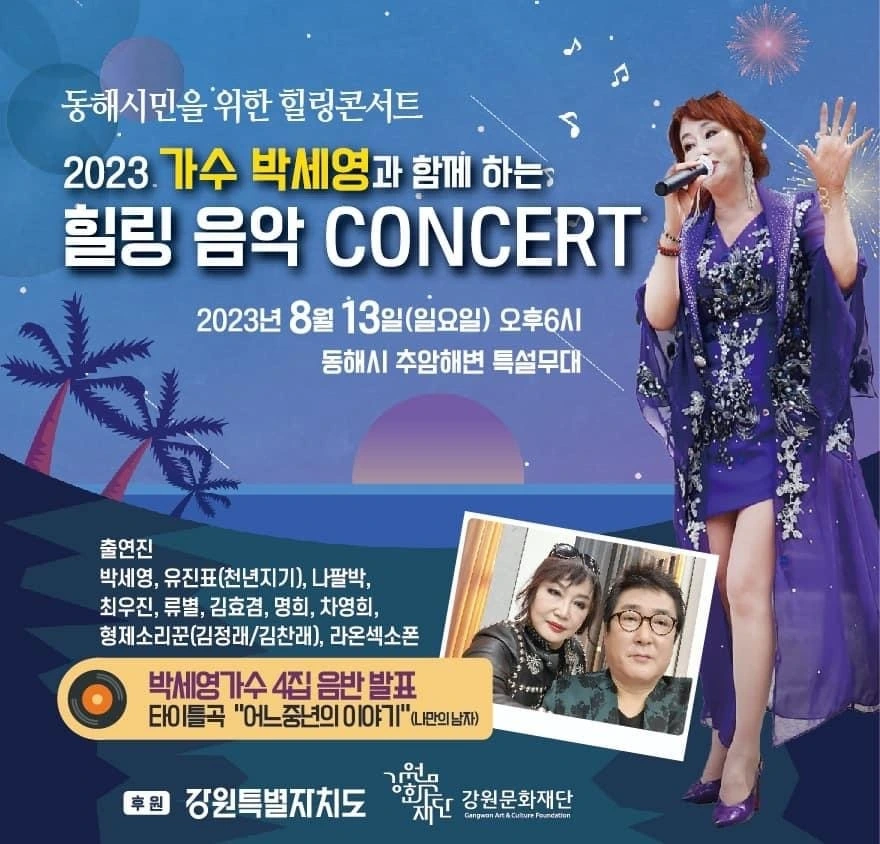 강원특별자치도 동해시에서는 지역출신 가수 박세영 중심의 힐링콘서트가 개최된다. 강원문화재단 공모사업으로 8월 13일 토요일 저녁 6시 동해 추암해변 특설무대에서 개최된다. 광역문화재단이 지역 대중가수에게 콘서트를 지원하는 일은 물론 참여 가수도 흔치 않다.