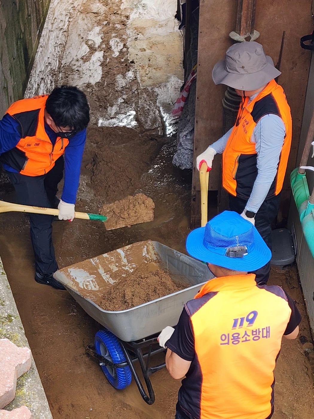 북평의용소방대 봉사자들이 참여해 동해시노인요양원 침수지역을 정비했다. 일출로 어달리 도로 주변 침수지역은 동해시 자원봉사대학 총동문회 회원들과 어촌마을 활력증진사업 마을 앵커조직 가족과 함께 복구를 진행 중에 있으나 일손은 부족하다.