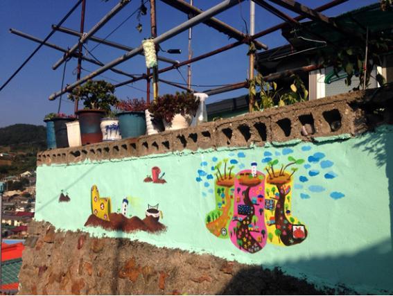 마을 사람들은 언덕 꼭대기에 생선말리는 덕장으로 오징어, 명태를 바지게나 고무대야로 날랐다. 이때 오징어 더미에서 떨어지는 바닷물로 늘 질었던 골목 때문이다. 항구 뒤편 묵호동의 비탈진 언덕에 지어진 판잣집 사이의 골목은 질퍽한 흙길 때문에 논골이라 불렸다. 논골담길 장화 이야기와 벽화는 직접 주민을 만나 이야기를 듣고 그들의 삶과 지역 정서, 문화를 벽화에 녹여냈다. 작가 개인의 성향이나 취향을 드러내지 않고 지역에서 공감할 수 있는 색깔을 입혀왔다.