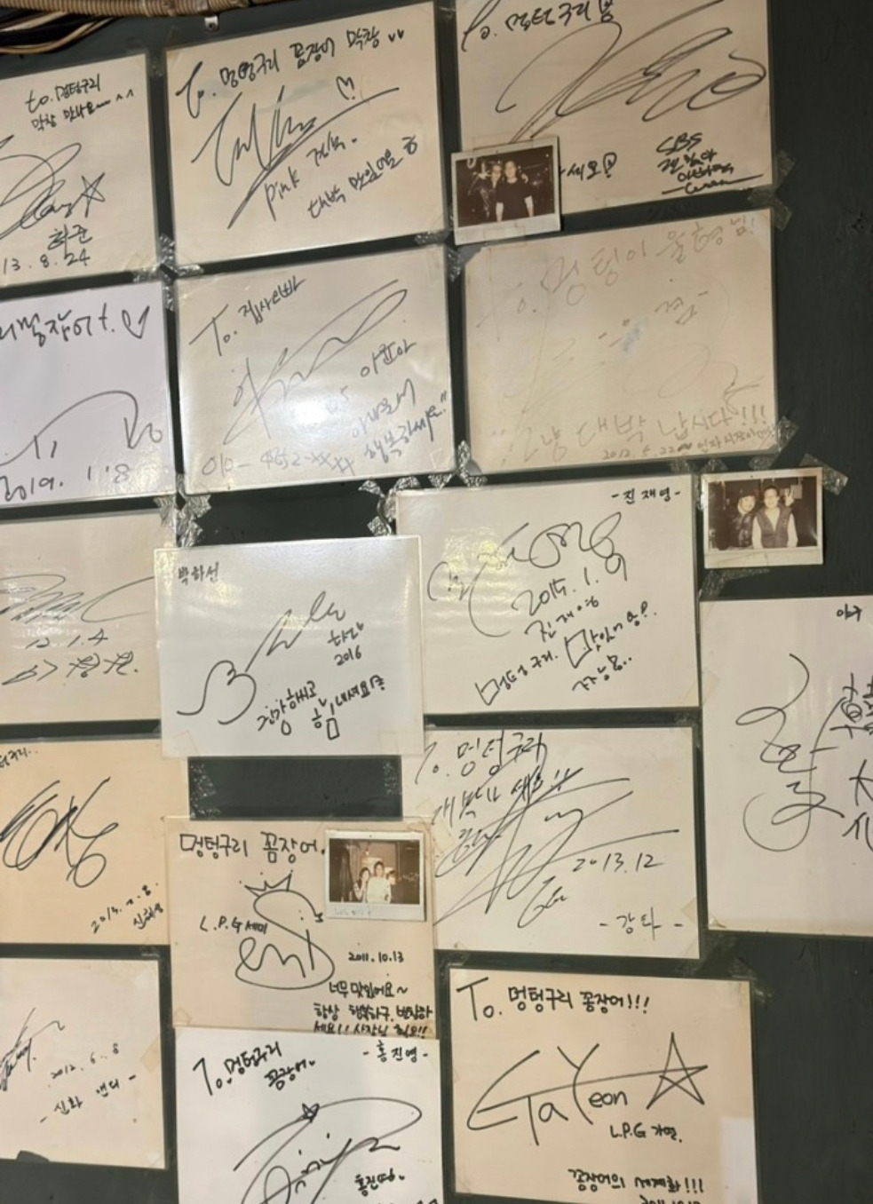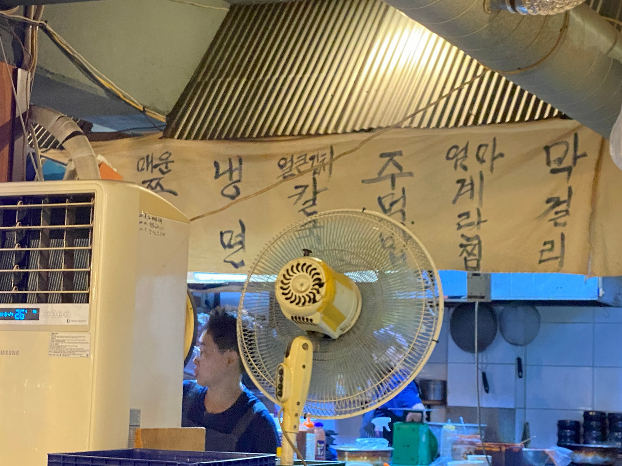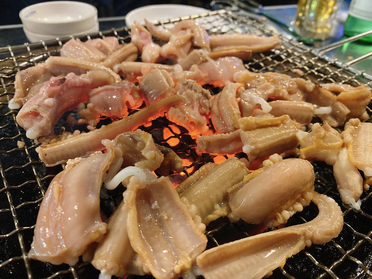 안주는 소금구이 곰장어로 시작했다. 안주를 시키면서 주방 쪽으로 얼굴을 돌리자 아주 재미있게 광목천에 주인이 직접 쓴 듯한 전통 분위기의 메뉴판이 인상적이었다. 주인은 왠지 가장 한국적이고 고향 맛을 강조하기 위해 메뉴판으로 의미를 전달하고 싶었다고 한다. 가게 이름 멍텅구리와 잘 어울리는 조화로운 메뉴판과 곰장어 맛은 고객들을 추억의 시간으로 유혹한다. 좌우 벽면은 유명인들의 칭찬, 추천 사인이 여러 장 붙어있다.
