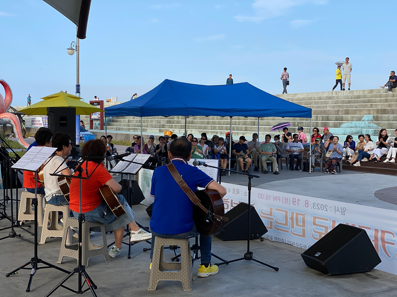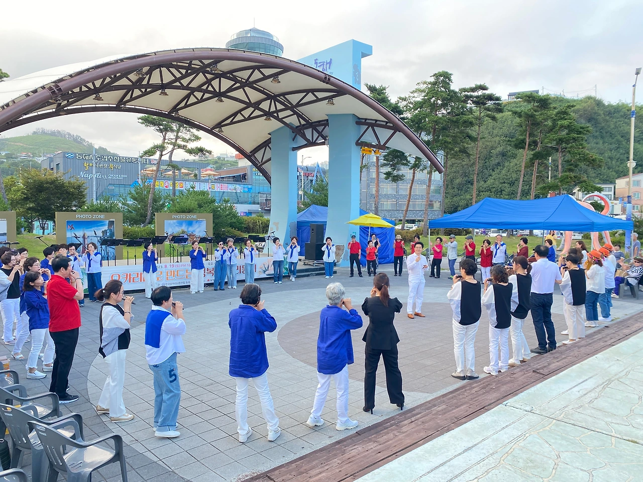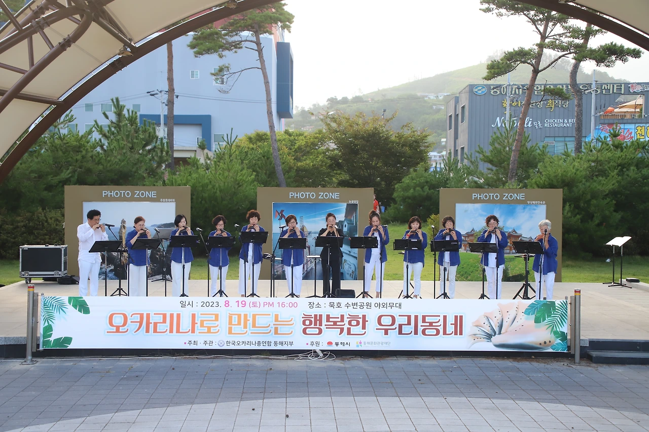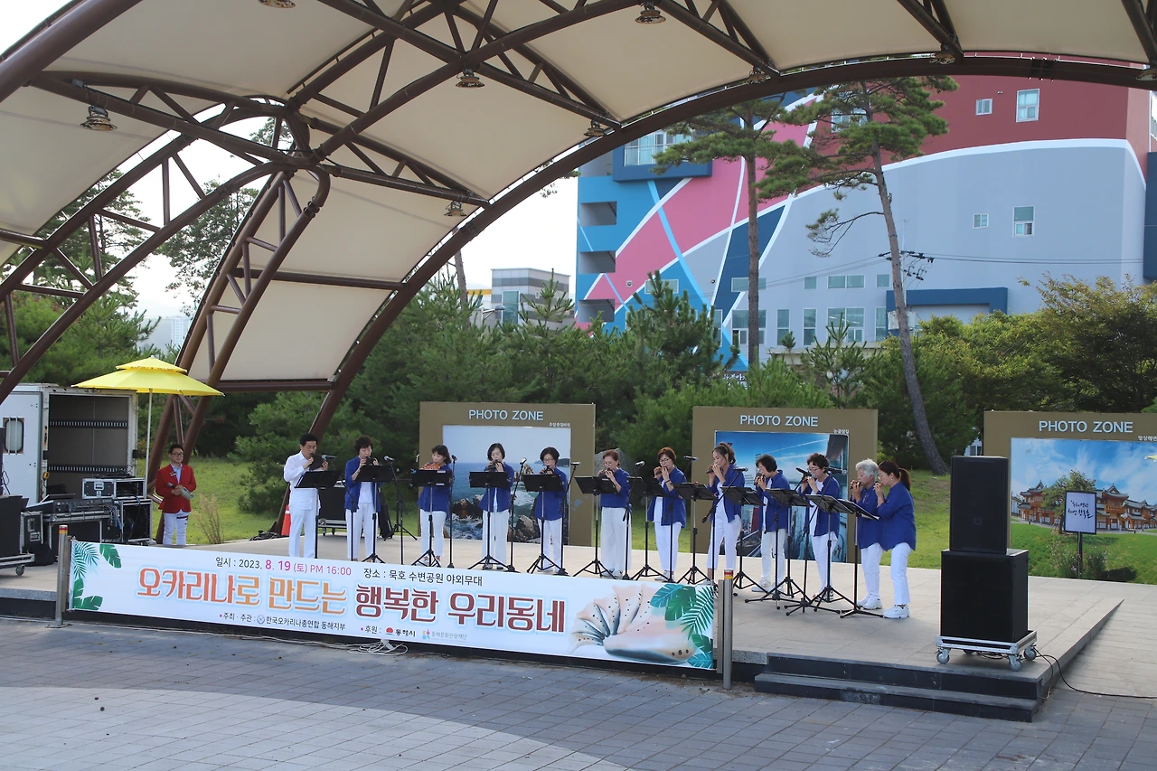 예산 탓보다는 동호인 중심으로 지역사회를 돌아보며 지역의 생활문화를 생산하는 모습이 인상적이다. 이날공연은 윈드 오카리나 앙상블 7중주의 <오카리나 폴카>로 시작해 동해 노인 종합복지관의 실버예술 오카리나, 동해문화원 노블레스 오카리나 <아침의 나라에서>, 키움 팬플룻 <엘콘도 파사>, 특별출연 낭만 통기타 칼립소 <아름다운 사람>, 하늘소리 오카리나 <사랑의 와이파이>, 심재춘 선생의 에어로폰 솔로 <누구 없소>, 정소영 오카리나 솔로 <도요새의 여행>과 마지막 순서는 이리랑 마치와 휘파람 합주다. 80여 명의 출연자 모두가 연주에 참여하고 2절은 출연진 모두 무대를 내려와 원형 대형으로 돌면서 <오카리나와 만나는 행복한 우리 동네>를 마쳤다.