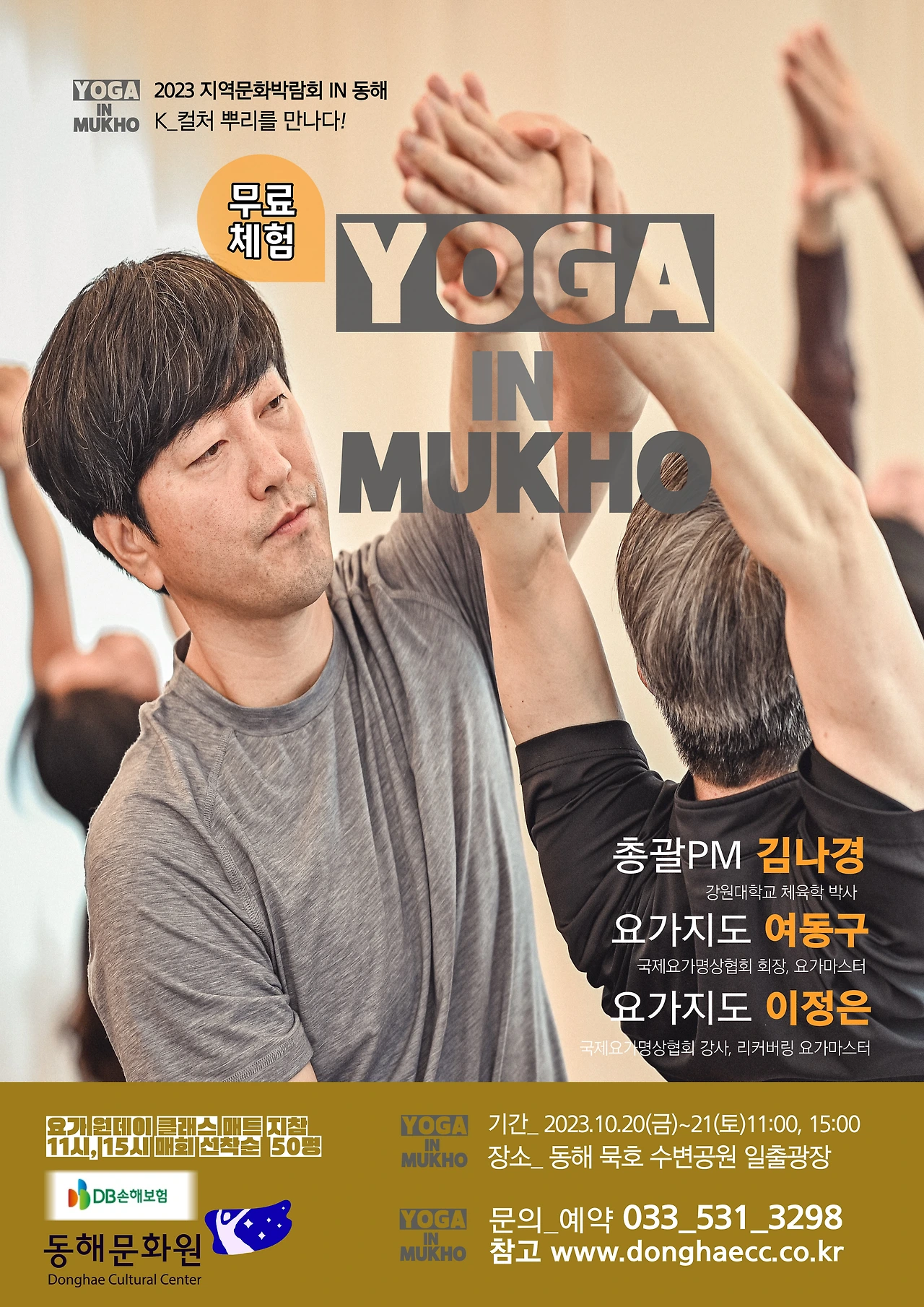 <요가 IN묵호>는 동해 묵호에서 오는 10월 20일과 22일까지 3일간 열리는 2023 지역문화박람회 IN 동해 참여프로그램으로 20(금) 일과 21(토) 일 양일간 오전 11시와 오후 3시 1일 2회, 2일간 총 4회 클래스를 현장 요가 수업과 요가 시범으로 진행한다. 동해문화원 일출요가 마스트 클래스 참여 프로그램은 음악요가로 21일(토) 오후 3시 클래스 시범에 참여한다.