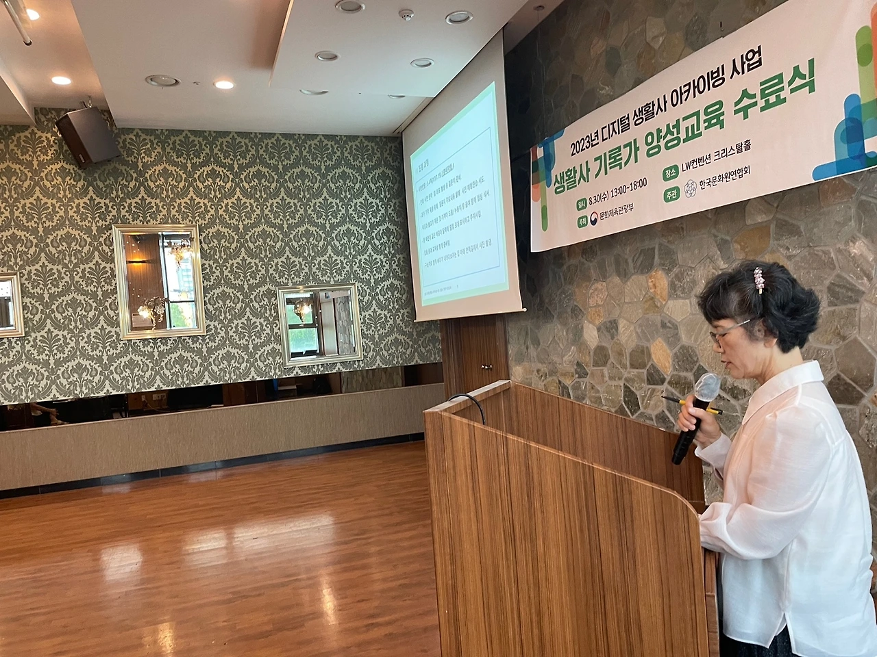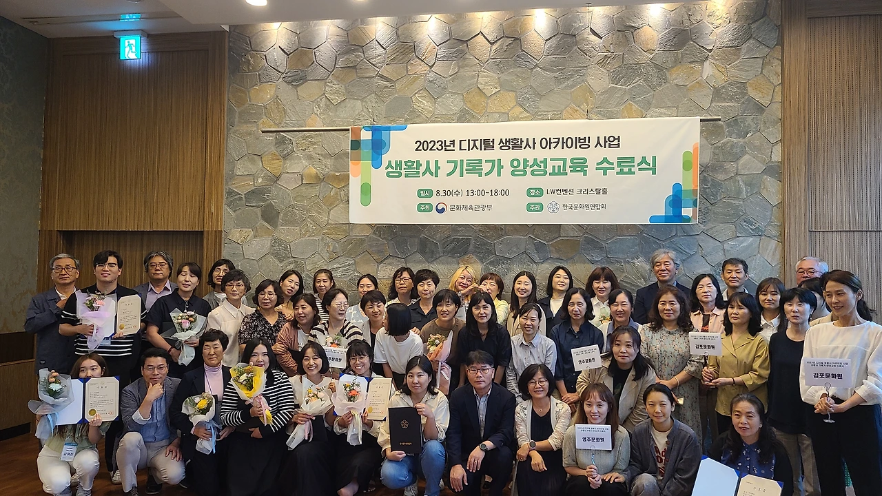 동해문화원, 대덕문화원, 김포문화원, 영주문화원, 울주문화원 등 5개 문화원이 시민 기록가 양성을 위해 공모사업으로 추진한 <2023 디지털 생활사 아카이빙 사업> 1단계 교육과정 수료식이 파일럿형태의 첫 구술과정을 마치고 30일 서울 LW컨벤션 크리스털홀에서 개최됐다. 시민대상으로 공개 모집한 문화원 기록가들은 서울을 직접 방문하는 총 10회 이상의 출장교육 참여와 각자 질문지를 작성해 사전 배정된 구술자의 구술을 진행하고 녹취록을 작성하는 등 힘든 여정, 1단계를 마무리하게 됐다.