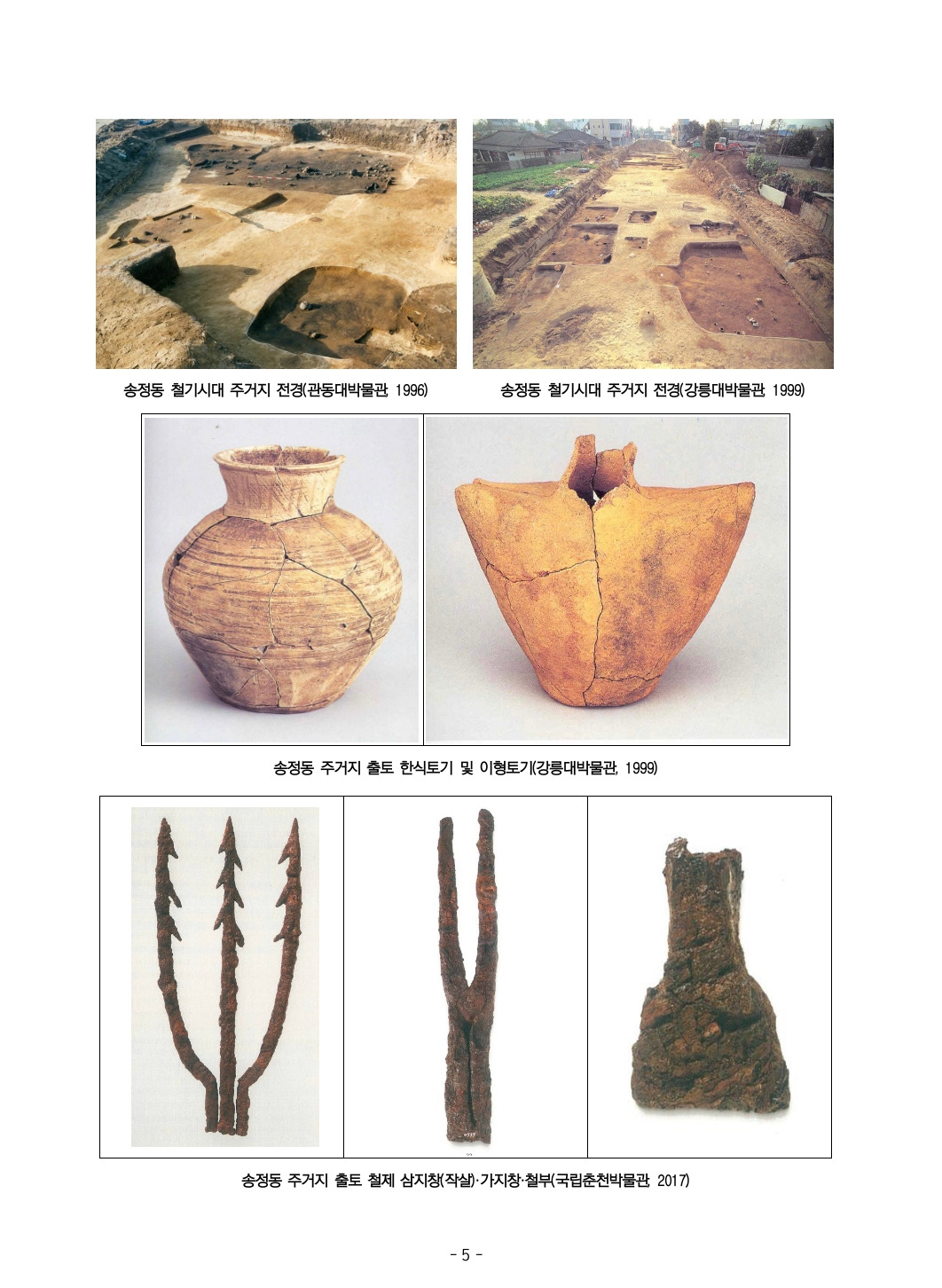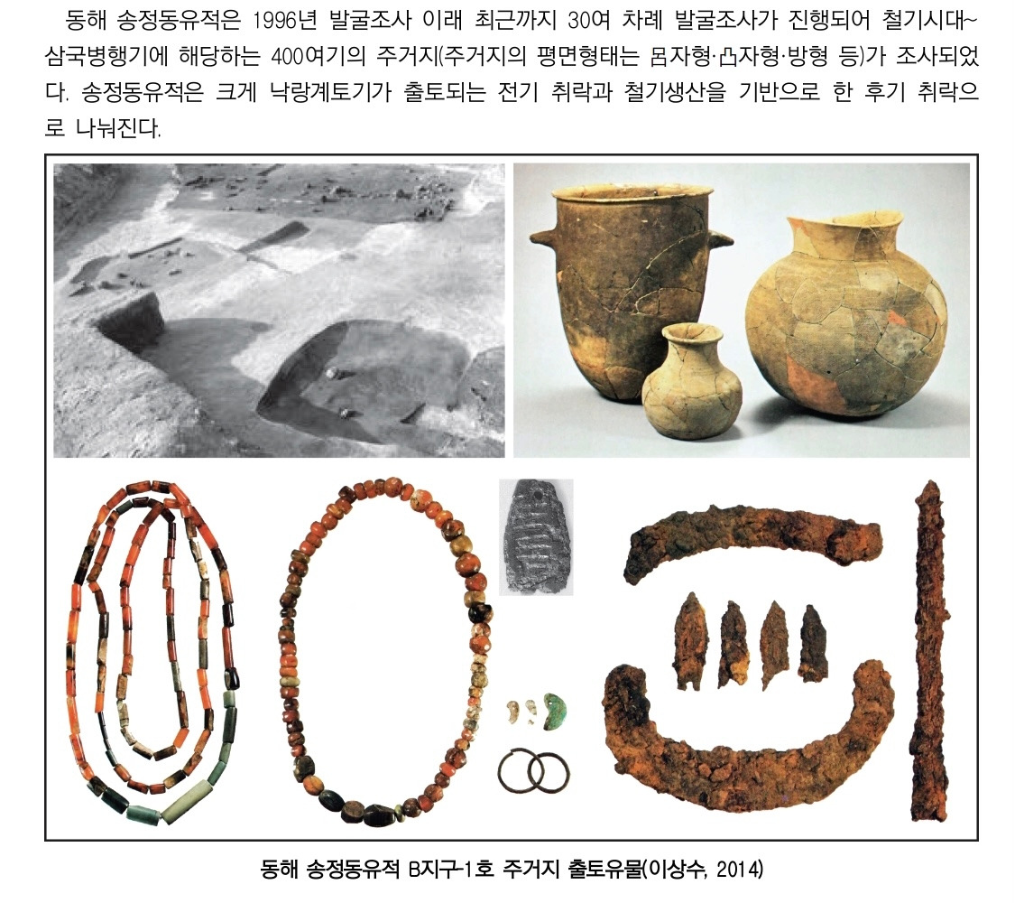 특히 송정동유적은 <영동지방 내에서 가장 많은 제철 관련 유구와 유물이 출토되어 적어도 3세기 무렵부터 4세기에 이르기까지 철기 제작과 생산이 활발하게 진행되었던 것>으로 이해되고 있다.