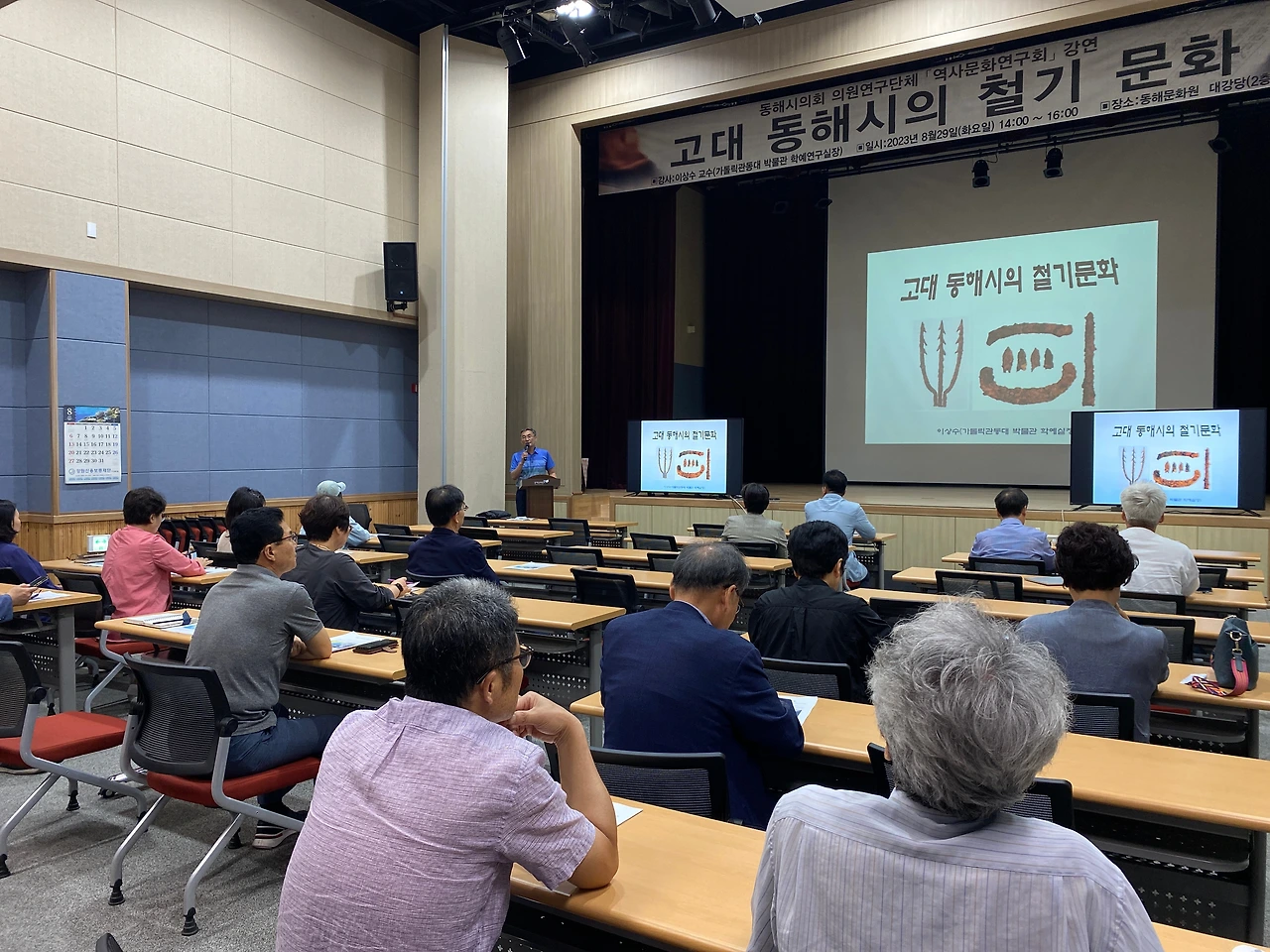 동해시의 고대 철기문화를 주제로 29일 오후 2시 동해문화원 강당에서 진행된 동해시의회 의원연구단체 <역사문화연구회> 스터디 모임 특강에 나선 이상수 실장(가톨릭관동대학교 박물관 학예연구실)은 동해 <송정마을은 영동남부 문화의 뿌리이자 철기생산의 거점이다.>라고 했다. 이날 스터디 모임은 의원연구단체를 이끌고 있는 동해시의회 이동호의장과 민귀희, 김향정의원과, 오종식 동해문화원장, 강원대학교 김대영교수, 홍협 동해학기록센터 연구원, 김원덕 전, 강원대학교 교수, 동해시 김대종 전통문화팀장, 동해시의회 장계화 사무과장, 한만영 전문위원, 김상진 정책지원팀장, 박찬호, 김효섭, 어광수, 이한천 지원관 등 100여 명이 참석했다.