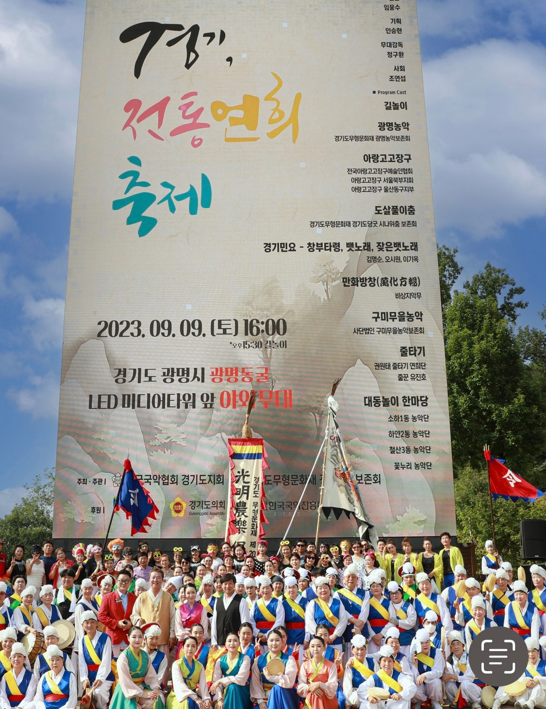 국악진흥법 제정안이 지난 6월 국회를 통과하고 국악계 각 분야에서는 다양한 기념사업들을 펼치고 있다. 경기도에서도 9일 오후 광명시 광명동굴 광장에서 진흥법 제정을 기념하는 제1회 경기전통연희축제가 개최됐다. 한국국악협회 경기도지회가 주최하고 (사)광명농악보존회가 주관한 이번 전통연희축제는 <K_컬처의 뿌리인 지역전통문화>를 체계적으로 발굴하고 지원하기 위해 경기도의회의 적극적인 관심과 경기도 지원으로 개최됐다.