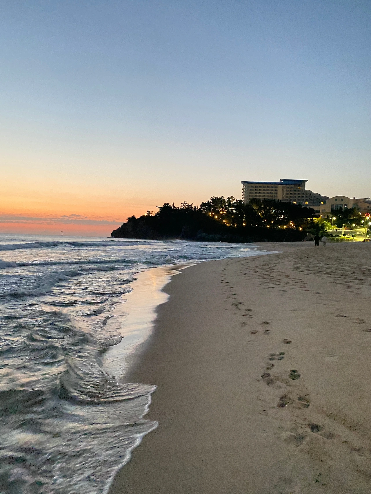 추암에서 동해의 아침을 만났다. 32일째 해변 맨발 걷기다. 둥근 눈썹모양의 그믐달의 하늘여행은 추암에서 과학교과서를 넘기는 느낌이다. 걷기 효과를 극대화하기 위해서는 공복, 특히 하루 중 아침식사 전에 1만 보 걷는 것이 가장 좋다고 한다. 아침식사 전에는 몸에 탄수화물이 부족해 같은 운동을 하더라도 지방 사용률이 높기 때문이다. 따라서 다이어트 목적으로 운동하는 사람들에게 공복 걷기는 더욱 효과적이다. 또한 공복 상태에서는 뛰어난 집중력을 발휘할 수 있다. 점심식사 후 노곤한 기분을 한 번쯤 느껴봤을 것이다. 음식을 섭취하게 되면 소화를 하기 위해 부교감 신경이 활성화되어 심장박동이 억제된다. 그러나 공복 상태에서는 심장이 억제되지 않기 때문에 공부를 하건 일을 하건 집중할 수 있다. 마찬가지로 운동도 공복 상태에서 할 때 더욱 집중할 수 있는 것이다.