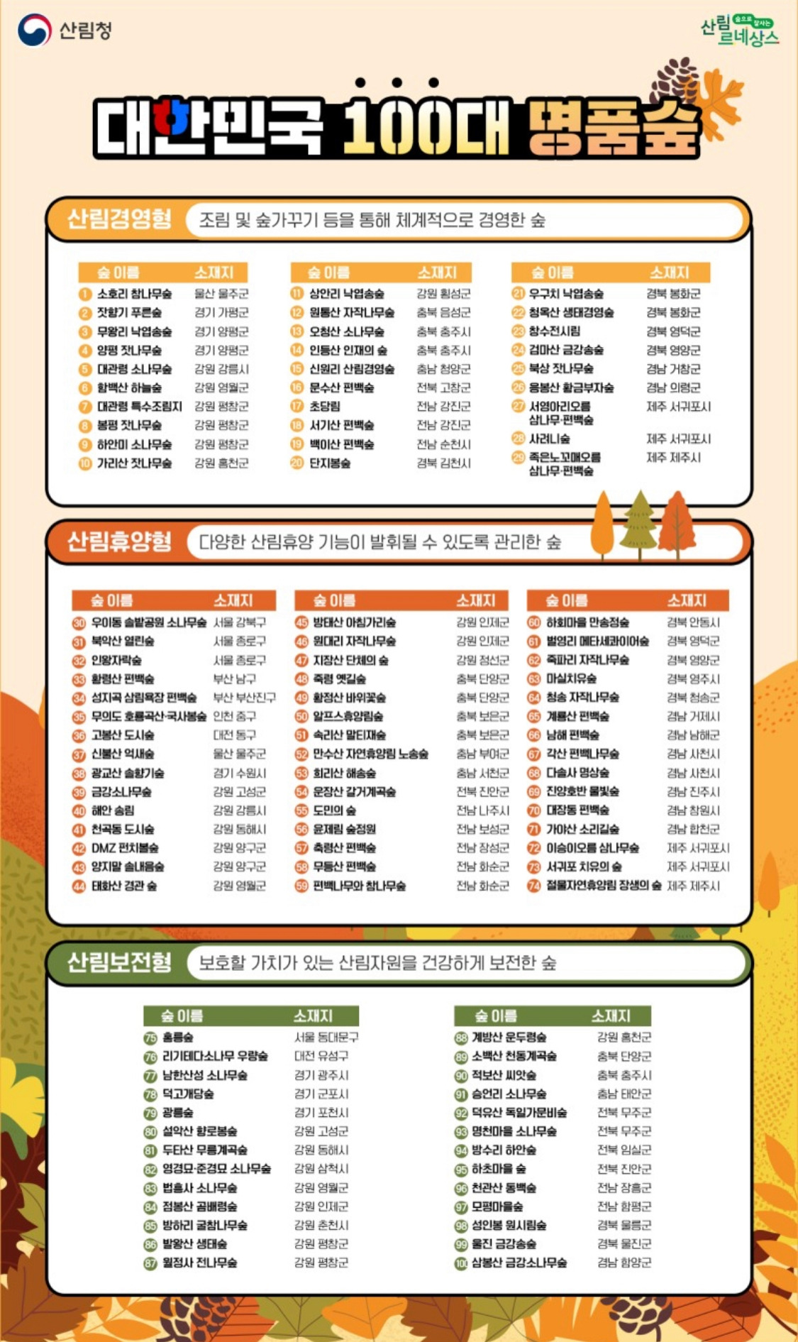 명품숲은 산림경영을 잘한 숲, 휴양을 즐기기 좋은 숲, 보전가치가 높은 숲 등 3개 분야로 나눠 선정했다. 산림청은 책자와 영상 콘텐츠, 안내판 등을 만들어 국민이 쉽게 명품숲을 찾아갈 수 있도록 지원할 계획이다. 앞서 산림청은 2017년부터 지난해까지 강원 인제 자작나무숲 등 국유림 명품숲 50개를 발굴한 데 이어 올해는 추가로 개인·기업·지방자치단체에서 관리하는 숲 50개를 찾아내 100대 명품 숲을 확정했다.