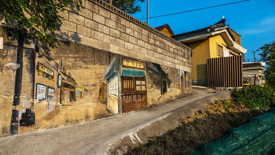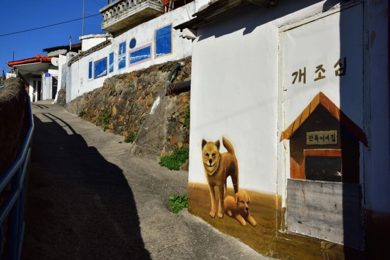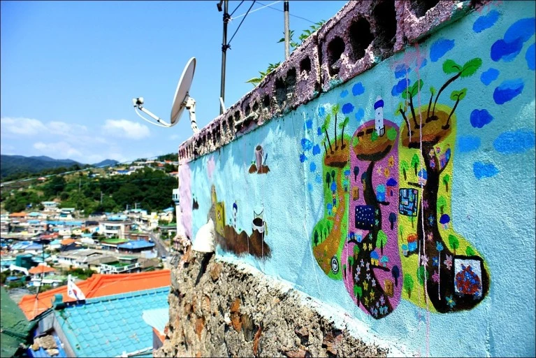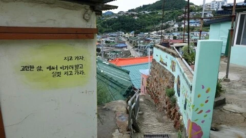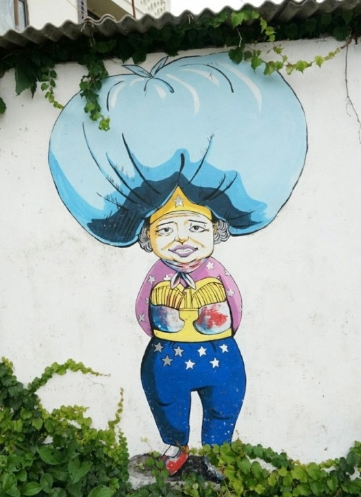 원더우먼을 패러디한 원더할매. 지난날 항구 언덕 마을 여성의 힘겨운 삶을 해학적으로 형상화한 벽화. 필자는 대한민국 최고의 벽화로 본다.