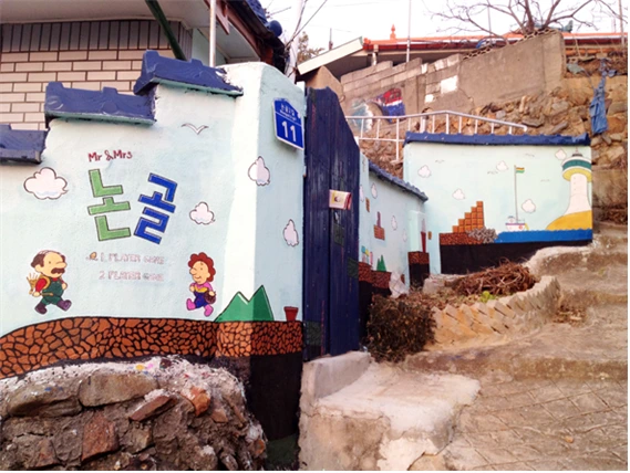 논골의 유명인사는 단연, 원더우먼 할머니다. 그 유명세를 이어 원더우먼 할머니와 지게 할아버지를 주인공으로 한 게임의 장면을 연출해 보았다. 90년대 추억의 게임인 마리오를 패러디해서 추억과 새로운 시대가 결합하는 콘셉으로 담아보았다. 논골담길이 지금 보다 더 유명해지는 날에는 모바일로 게임이 만들어서 많은 사람들이 사용할 수도 있지 않을까 하는 재밌는 생각을 해본다. 이번 브런치는 논골담길 초기 벽화를 돌려달라는 주문이 많아 브런치로 기록하며 추억여행을 떠나 본 시간입니다.