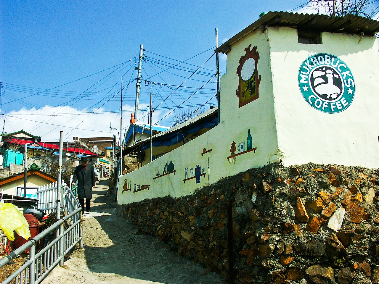 묵호벅스 벽화이다. 이름 그대로 세계적으로 유명한 스타벅스의 짝퉁 명칭이다. 멀리서 보면 스타벅스 로고로 보이지만, 가까이서 보면 야간에 등대가 주변을 비추는 묵호항의 풍경을 로고로 만든 것이다.