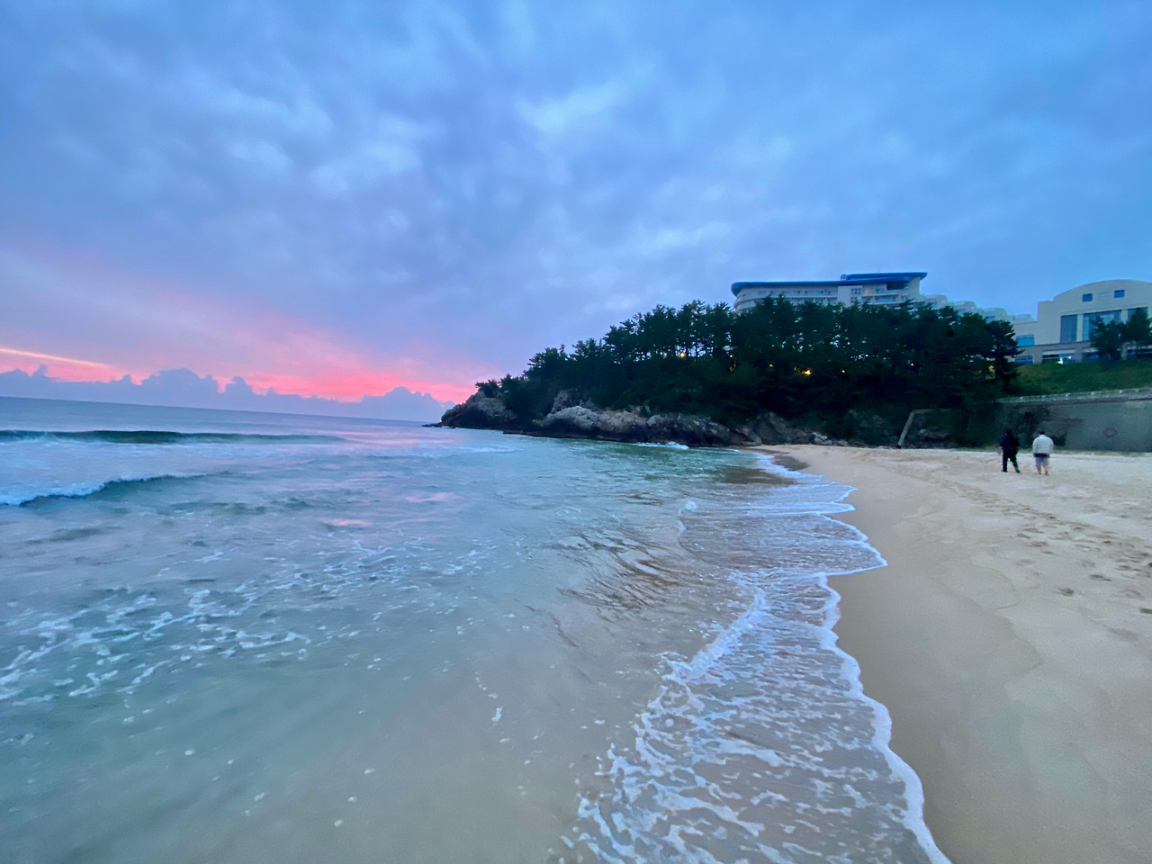 오늘도 추암에서 아침을 만났다. 해변 맨발 걷기 33일째다. 해변 좌측 촛대바위에서 우측 솔비치 방향으로 3회 정도 쉬엄쉬엄 왕복하면 한 시간 정도 소요된다. 여명의 시간은 일출이 오를 6시 25분 정도다. 해는 구름에 가렸다. 잠시뒤 구름뒤로 피어오르는 찰나의 여명은 환상적이다. 조용히 걷던 걷기 여행자들도 휴대폰으로 잠시의 여명을 담는 모습들이다.