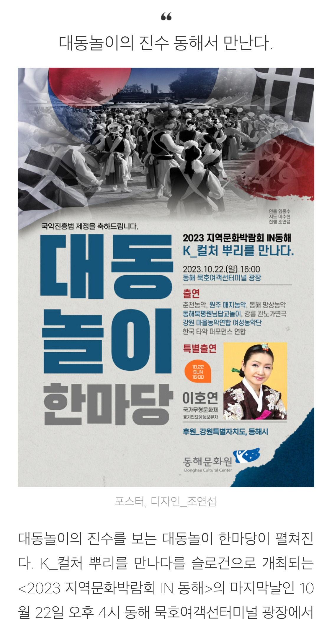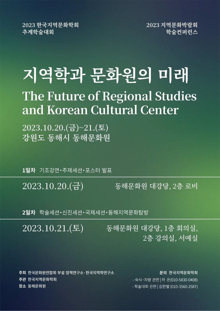 한국문화원연합회와 동해문화원이 공동 주최ㆍ주관하고, 문화체육관광부, 강원특별자치도, 동해시 등이 후원하는 ‘2023 지역문화박람회 in 동해 <K-Cutlrue 뿌리를 만나다>’가 오는 10월 20일(금)부터 22일(일)까지 동해 묵호항 여객선 터미널 광장 등 동해시 일원에서 개최된다.