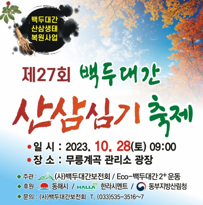 백두대간의 중심 두타산에 지난 26년간 산삼 심기 국민운동을 펼쳐온 (사)백두대간보전회가 제27회 백두대간 산삼심기 축제를 10월 28일 오전 9시 동해시 두타산 무릉계 매표소 광장에서 개최한다.