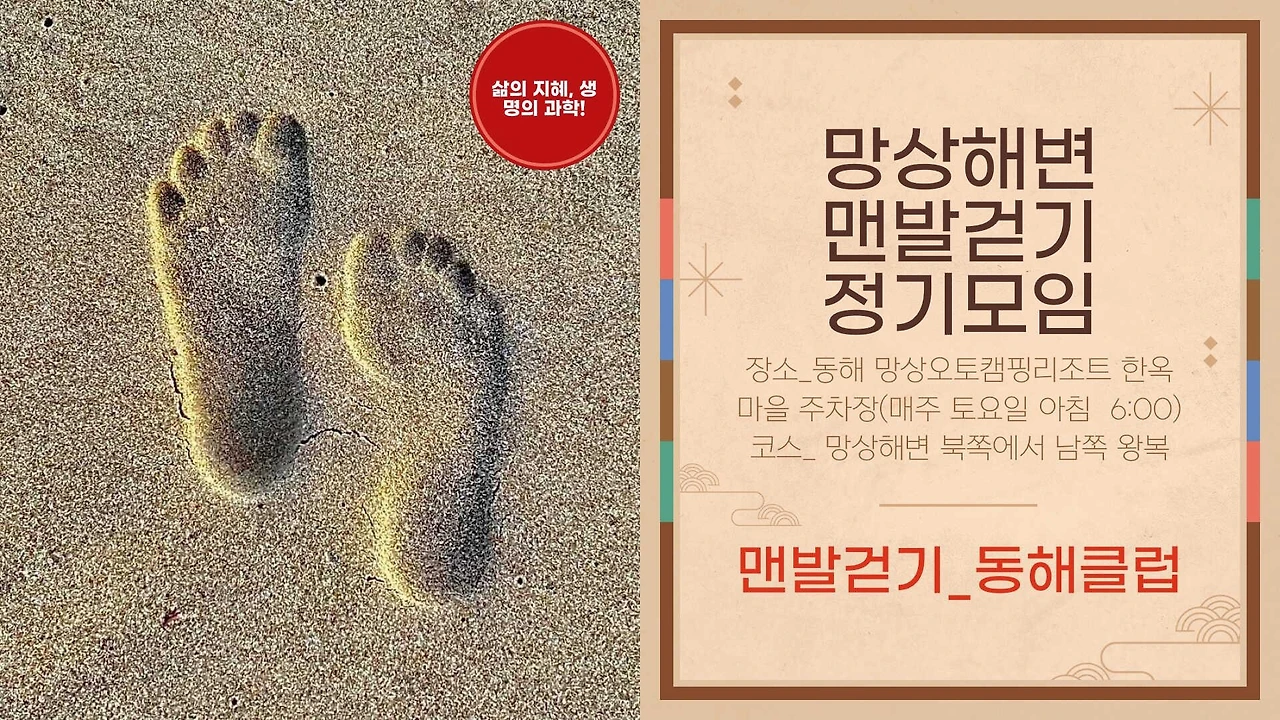 해변 맨발 걷기 동해클럽에서는 매주 주말 아침 일출과 함께 맨발 걷기를 진행합니다. 시간은 여명이 시작되는 이침 6시이며 집결장소는 동해 망상오토캠핑리조트 끝쪽에 있는 한옥마을 주차장입니다. 걷기 코스는 새벽 여명이 환상적이고 백사장이 넓고 모래가 고운 망상명사십리 해변 북쪽에서 남쪽을 왕복해 걷습니다.