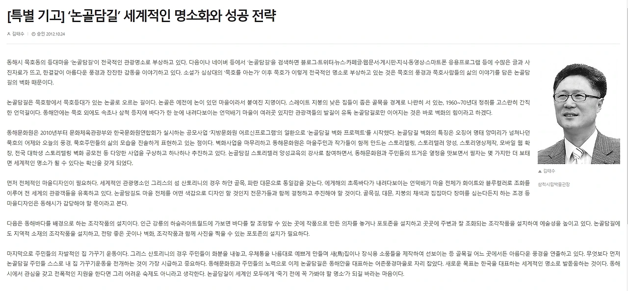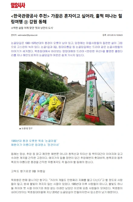 중앙일보 기사에서 논골담길을 묵호항 추억의 그림길로 소개하면서 묵호등대마을 일대를 감성관광지 1번지로 가꿔 체류형 관광지로 변모시키겠다는 2014년 2월 기사다.