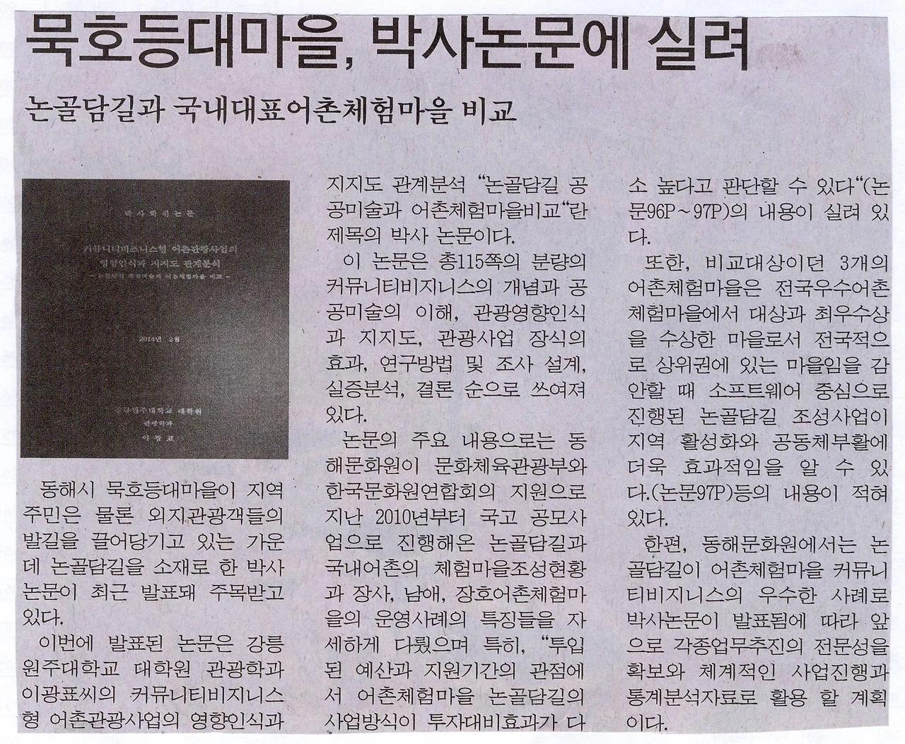 논문 주요 내용은 동해문화원이 문화체육관광부와 한국문화원연합회의 지원으로 지난 2010년부터 국고 공모사업으로 진행해 온 논골담길과 국내어촌 체험마을 조성현황과 장사, 남애, 장호어촌체험마을 운영사례의 특징들을 자세하게 다뤘다. 특히, "투입된 예산과 지원기간 관점에서 어촌체험마을 논골담길 사업방식이 투자대비 효과가 높다고 판단할 수 있다“(논문 96P~97P)의 내용이 실려 있다.