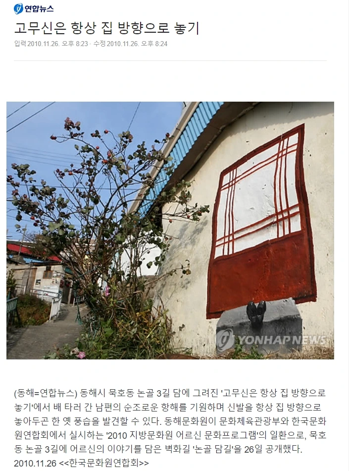 동해시 묵호동 논골 3길 담에 그려진 '고무신은 항상 집 방향으로 놓기'에서 배 타러 간 남편의 순조로운 항해를 기원하며 신발을 항상 집 방향으로 놓아두곤 한 옛 풍습을 발견할 수 있다. 동해문화원이 문화체육관광부와 한국문화원연합회에서 실시하는 '2010 지방문화원 어르신 문화프로그램'의 일환으로, 묵호동 논골 3길에 어르신의 이야기를 담은 벽화길 '논골 담길'을 26일 공개했다. 2010.11.26