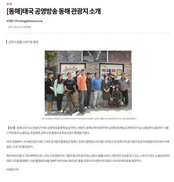 태국의 방송은 채널 번호로 운영하는데 채널 5는 상업방송이면서 채널 운영은 육군이 한다. 광고 시장은 20% 정도며 2012년 5월 14일부터 4일간 취재차 방문했다. 유명 배우 니티사뭇코존과 MC 스텝 등 9명이 방문했다. 논골담길을 비롯해 관내 관광지를 취재해 다음 달인 6월 태국방송 채널 5, 프로그램 <출동 코리아>로 태국 전역에 방송했다.