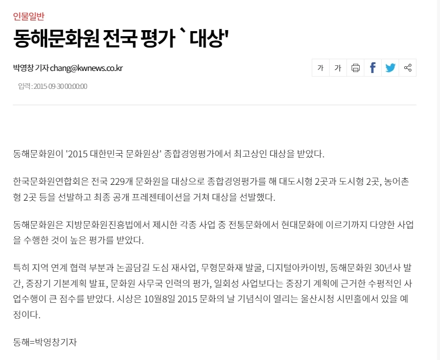 동해문화원이 논골담길 등 사업운영결과로 2015년 전국 231개 문화원대상으로 종합 경영 평가를 실시한 결과 대상을 수상했다는 강원일보 2015년 9월 30일 기사다.
