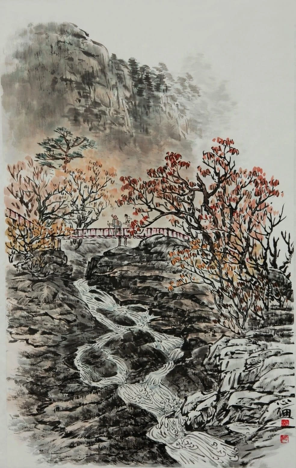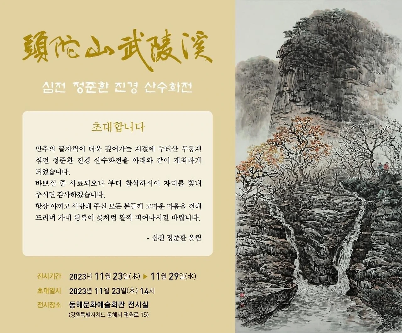 기백과 절제의 멋 표현이 뛰어난 중견 문인화가 심전 정준환 화백의 진경산수화 작품전‘두타산 무릉계’를 축하드립니다. 정 화백은 1983년부터 대한민국미술대전 한국화, 사군자, 문인화 부분에 입선하고 가톨릭관동대학교 교육원 문인화 강사 출강과 동해문화원 강사 등 개인전, 초대전, 그룹전, 공모전, 기획전 다수 기획과 참여 등 경력의 중견 화가입니다. 화백은 이번 전시를 하늘과 땅 사이에 사람이 존재하는 천지인 정신을 담았다고 강조하며 자연과 호흡하는 산수 그림의 세계로 자연 속에 살아 숨 쉬는 실경의 작품을 통해 아름다운 동해를 알리고 싶다고 했습니다.