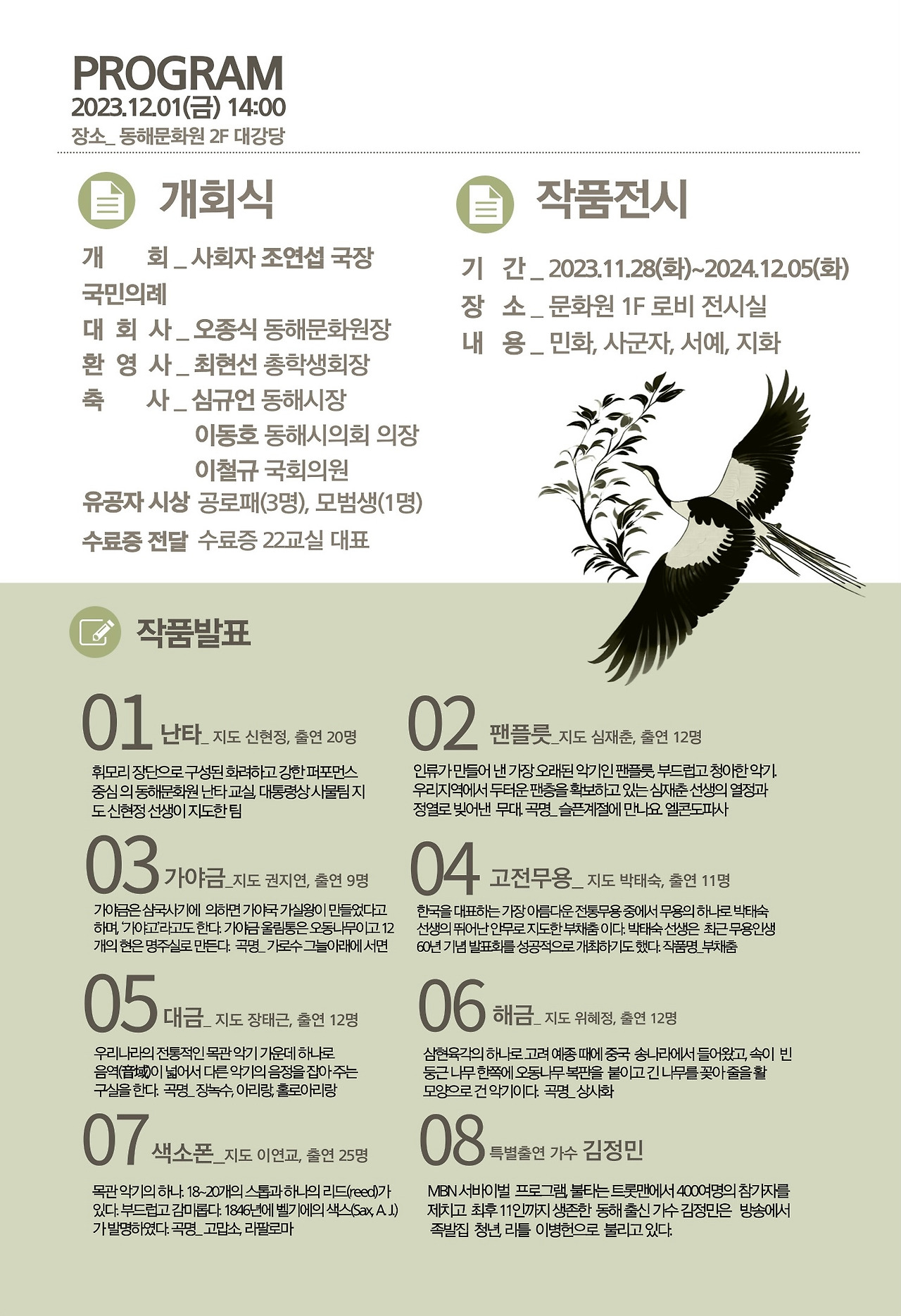 동해문화원(원장 오종식)은 2023 문화학교 성과공유회를 11월 29일부터 12월 5일까지 6일간 문화원 일원에서 개최한다고 1일 밝혔다.