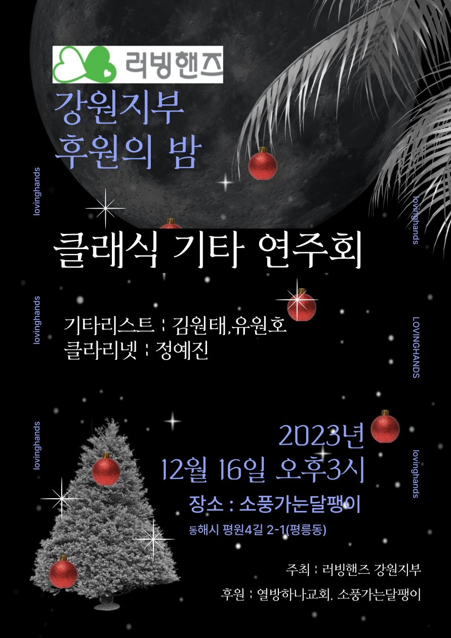 한명의 아동·청소년을 자립할 때까지 지속해 돕는 멘토링 전문 사회복지 NGO, 러빙핸즈 강원지부 후원의 밤, <클래식 기타 연주회>에 초청합니다.