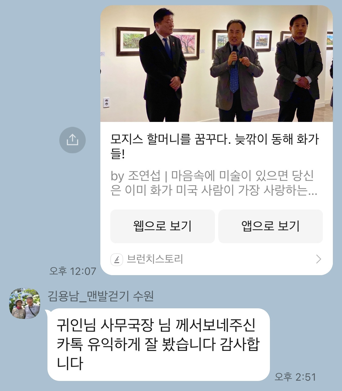 브런치스토리 글을 쓰던 휴일, 모르는 전화 한 통이 울렸다. 받아보니 그날 한섬에서 만난 부부였다. 나는 안부인사와 동해 방문 감사의 뜻을 전하고 브런치로 글을 남기려고 작성 중이라고 밝히고 연세와 존함을 문자로 남겨주세요 하고 전화를 끊었다. 잠시 뒤 카카오톡으로 ”저는 77세, 수원 권선구에 사는 김용남입니다 “라는 문자가 왔다. 저는 감사합니다. 낼 아침 브런치 매거진이 발행되면 보내드리겠다고 댓글을 남기고 오늘 발행 브런치스토리 매거진 동쪽여행, 모지스 할머니를 꿈꾸다. 동해 화가들! 을 보내드렸다. 어르신은 잠시 뒤 “귀인님 사무국장께서 보내주신 카톡 유익하게 잘 봤습니다. 감사합니다” 문자가 도착했다. 단 한번 만났지만 우리는 오래 알고 지낸 지인처럼 편하게 문자로 대화를 이어갔다. 김나경 체육학박사는 “맨발 걷기를 통한 스트레스 호르몬 완화, 면역력 증가 등의 효과가 사회적 효과로 보이는 사례”라고 한다.