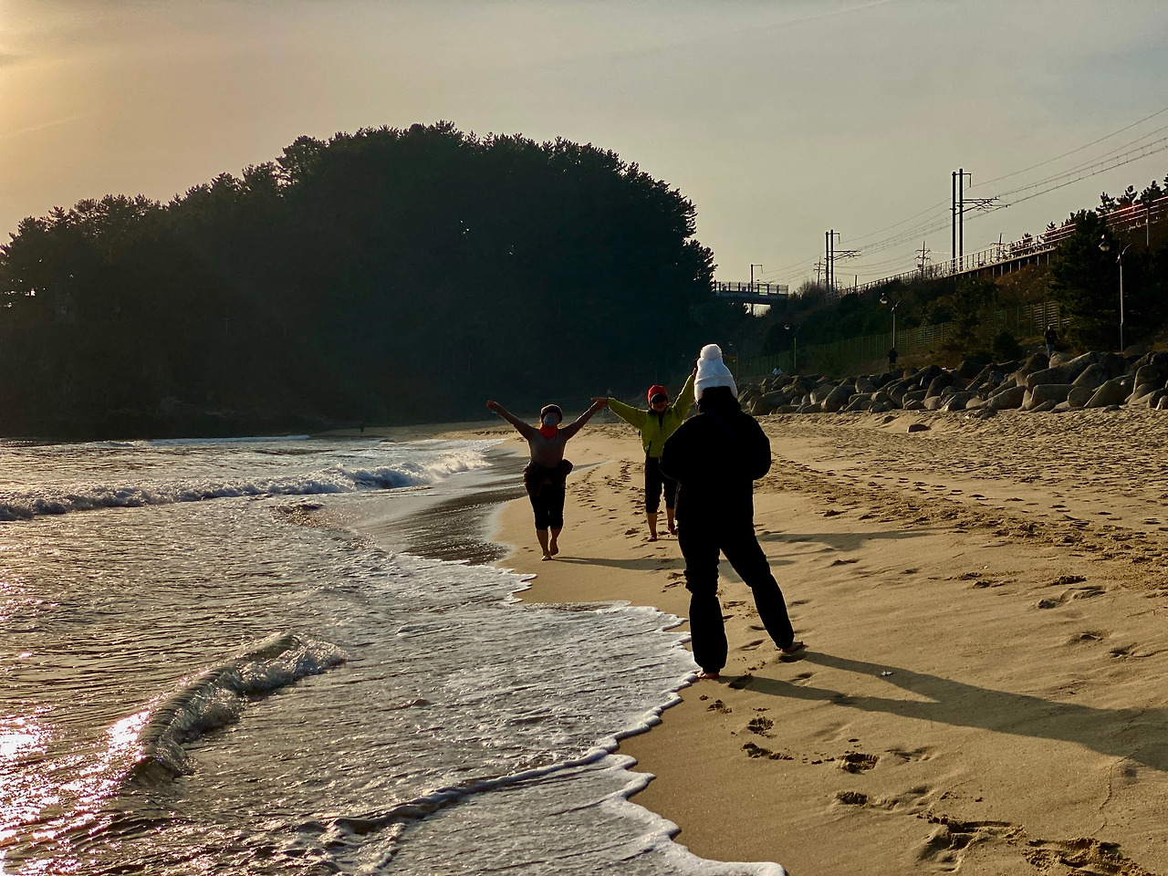 부부는 아들 사업 거래처가 동해에 있어 지역을 자주 찾는다고 한다. 우리는 멋진 맨발 걷기 여행을 떠나는 동지라며 손을 잡으신다. 서로 태어나고 성장한 지역과 개인 삶은 달라도 맨발 걷기를 하는 사람을 만나면 처음 봐도 그냥 반갑다고 밝은 표정으로 인사를 나눴다. 옆에서 젊은 연인 한쌍이 신발을 신고 모래 위를 걷는다. 어르신 부부는 말한다. 언제부턴가 저렇게 걷기의 소중함을 아직 몰라 해변을 신발 신고 걷거나 뛰는 사람을 볼 때는 <신발을 벗고 걷지> 하는 맘이 들어 아쉽다고 한다.