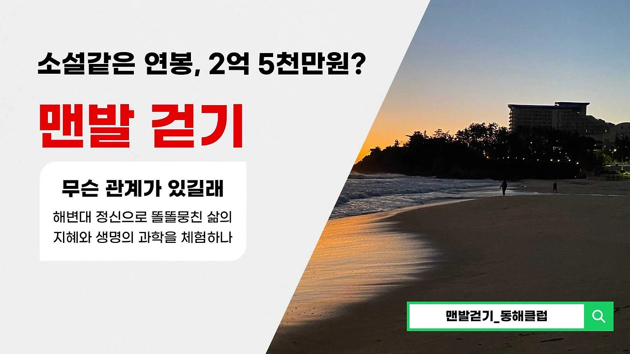 연봉은 모두 포함해 봤자 실제 5천만 원도 채 안 되는 문화노동자다. 동해 지역의 멋진 곳 <추암과 행복한 섬 해변을 각각 1억 원씩 제게 준 연봉으로 생각하고 맨발로 걷기 때문에 제 연봉은 2억 5천만 원이라는 말>이다. 조만간 연봉은 또 인상될 예정이다. 한양정맥 걷기 길 때문이다. 이 길은 육지길로 동해 천곡 한양아파트 뒷산에서 문화원 뒤까지 이어지는 산에 있다고 일명 ‘한양정맥’이라고 한다. 얼마가 오를지는 실제 현장답사가 더 있어야 결정 날 예정이다.