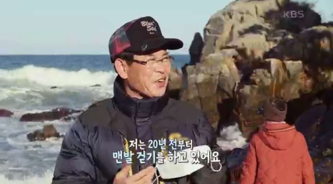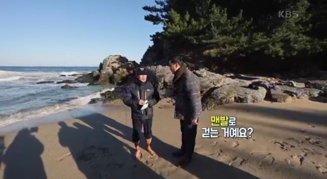 맨발 걷기_96일째 진행 중인 동해 행복한 섬 해변이 맨발 걷기 명소로 소개됐다. 방송은 23일 저녁 7시 10분부터 방송된 <KBS 동네 한 바퀴>다. 씨름장사 출신 예능인 동네 아들 이만기 씨가 직접 해변을 맨발로 걸으면서 맨발 걷기에 나선 고창윤 전 동해경찰서장을 비롯한 주민들을 만났다. 이만기 씨는 20년 전부터 걸었다는 고 전 서장에게 춥지 않으세요? 고 질문하며 발을 만져보고 말한다. 선생님 따뜻하네요 하자 고 서장은 <바다는 염분이 있어 얼지 않아요 또 바다는 계절을 늦게 따라가고 따뜻한 열을 만나 10분 정도 걷게 되면 포근하다. 맨발 걷기는 해변 걷기가 최고라 전문가들은 해변 맨발 걷기를 ‘슈퍼어싱’이라 부른다. 특히 겨울철 걷기는 일조량이 풍부한 낮시간을 이용해 달라> 라고 했다.