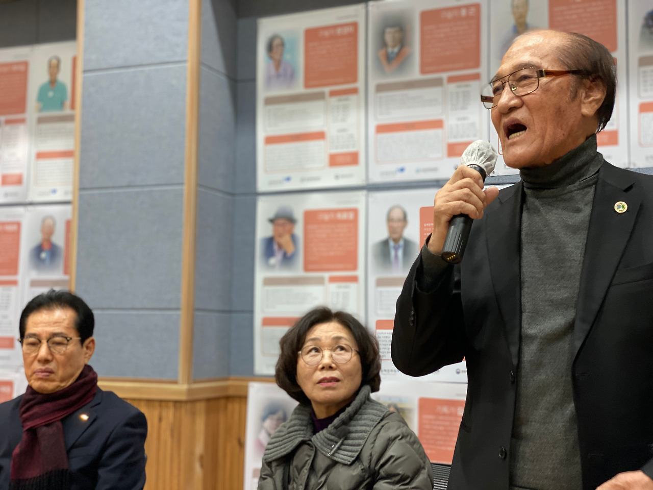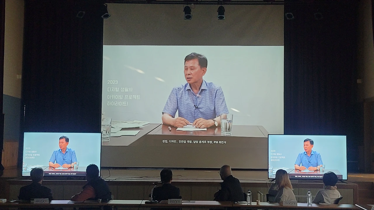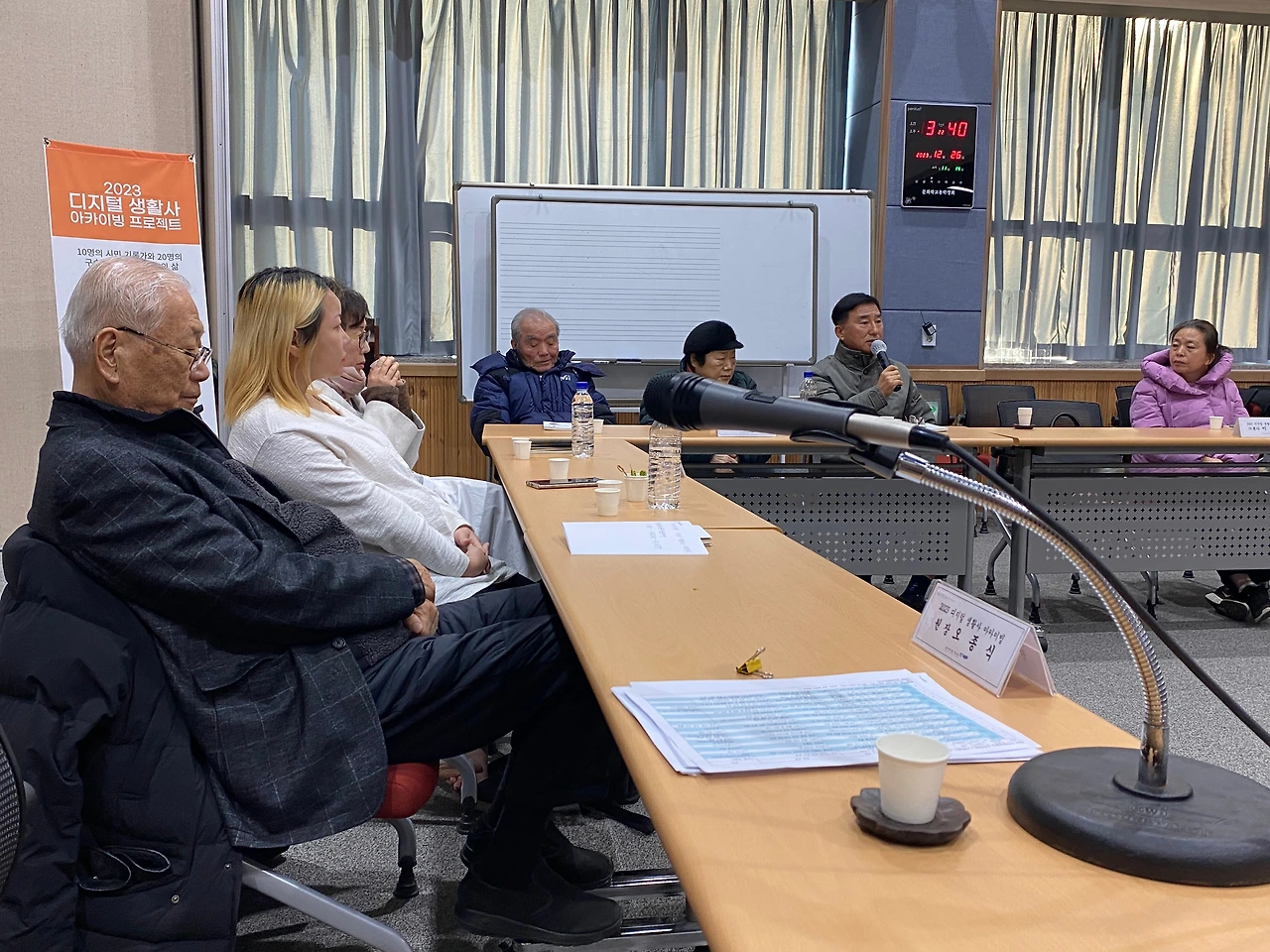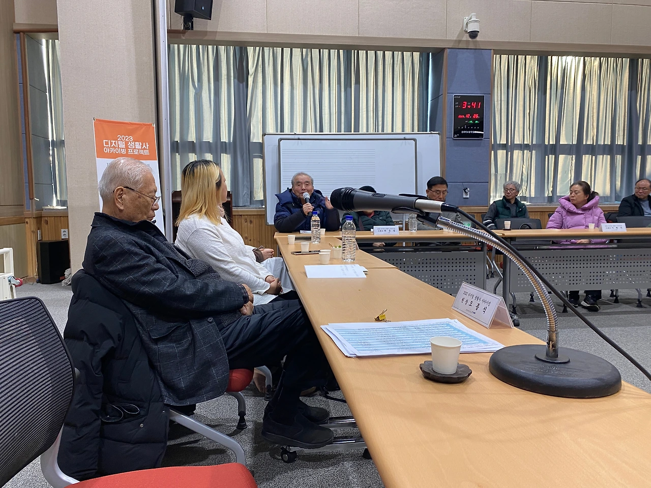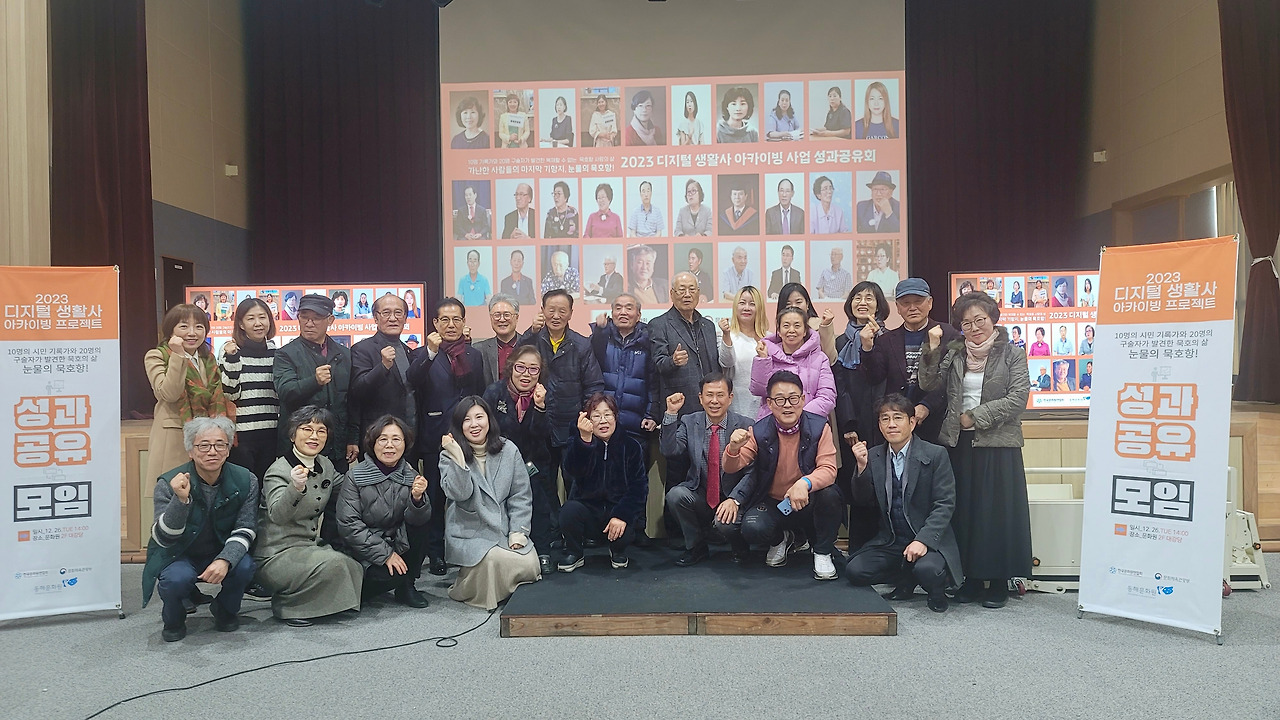 2023 디지털 생활사 아카이빙 사업 성과공유회가 26일 오후 2시 동해문화원 2층 대강당에서 개최됐다. 구술자로 참여해 고등학교 1학년 시절에 야학을 설립하고 학교를 세우면서 어렵게 자수성가한 전억찬 회장과 한평생 배사업에 종사했다는 황종태 구술자는 평소 이북과 어로 경계선이 명태가 잘 잡히는 바람에 어업 중 이북으로 납북돼 이북에서 3개월을 지내다 돌아온 이야기 등 두 분은 못다 한 이야기를 이어가며 눈물을 글썽이기도 했다.