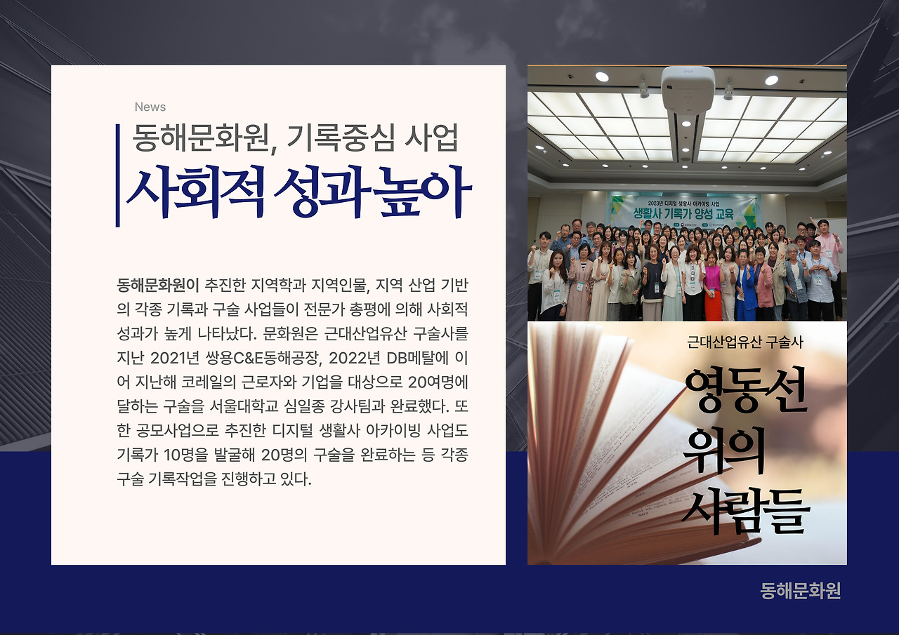 동해문화원이 2023년 순수 국비로 추진한 ‘디지털 생활사 아카이빙’ 사업과 ‘근대산업유산 구술사’를 포함한 각종 기록 사업 성과공유회 결과 다양한 분야에서 사회적 성과가 높게 나타났다.