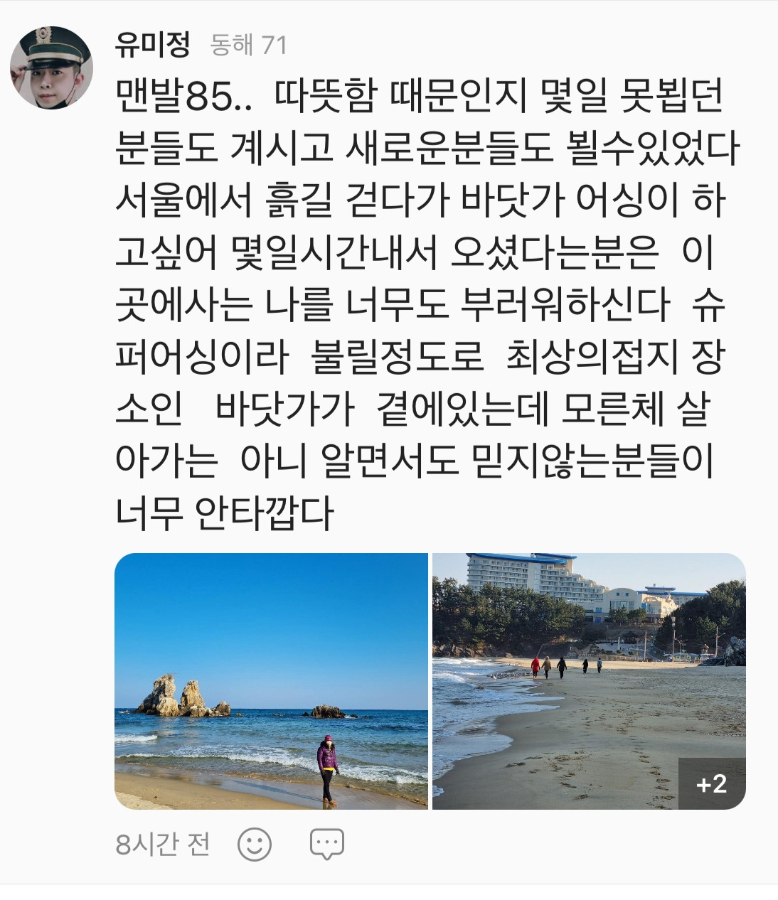가는 병원마다 지루성 피부염이라는 진단뿐이었다. 서울대학병원마저도.. 통증이 너무 심해 아침에 눈을 뜨는 것조차 싫을 때가 있었고 그렇게 불안증 마지 생겨버렸다. 지인 소개로 정신의학과에서 여러 검사를 했고 뇌 기능 문제로 세로토닌 분비가 안된다 는 소견과 너무 오랜 기간 치료하지 않아 만성통증으로 이어진 케이스라고 도 들었다. 결국 과다한 스트레스로 생긴 질환에 갱년기까지 찾아오면서 고통은 배가 되었다. 2016-2023년까지 정도의 차이만 있을 뿐 어떤 노력을 해도 잠시 뿐이고 무너지기를 여러 번... 어느 날 서울 사는 친구가 권한 운동이 맨발 걷기였다. 치유 개념보다 운동이라 생각하고 일단 걸어보자 싶어 시작하게 된 것이 맨발 걷기의 시작이었다. 관내 청운초등학교 운동장을 한 달 정도 걷다가 우연히 맨발 걷기 동해클럽 조연섭 리더와 회원들이 같이 진행한 해변 맨발 걷기 영상과 브런치스토리 이야기를 접하다가 남겨진 글에 <추암을 여성스러운 해변>으로 표현한 조연섭 리더의 카피에 감동해 오늘부터 <추암해변은 나의 해변으로 접수한다> 며 맨발로 걷기 시작한 지 3개월 정도 된다.