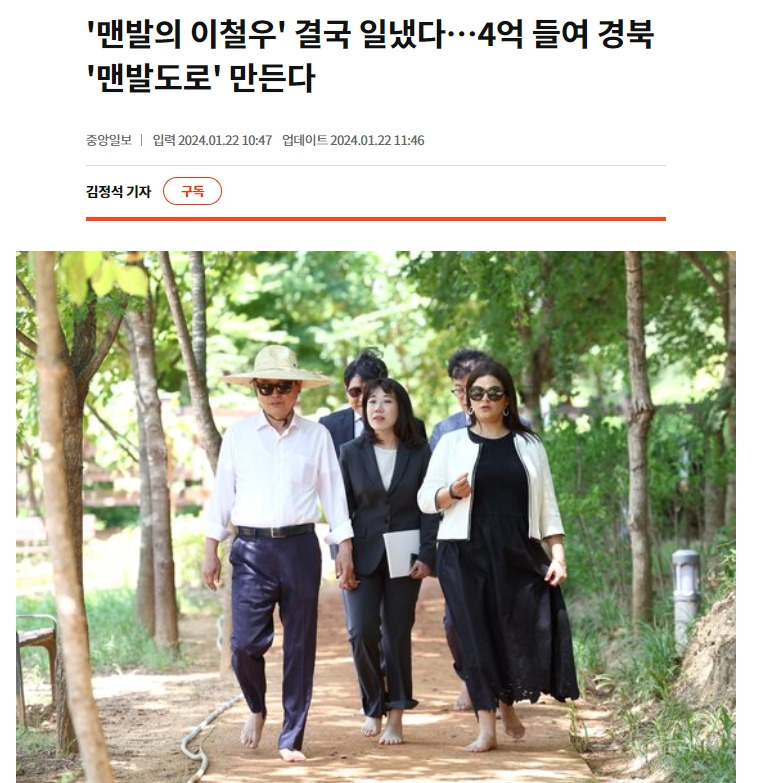 "맨발의 이철우, 결국 일냈다…4억 들여 경북 '맨발도로' 만든다"