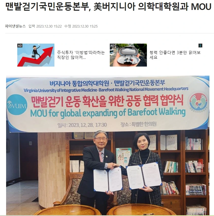 맨발 걷기 국민운동본부와 미국 버지니아 통합의학대학원 업무 협약