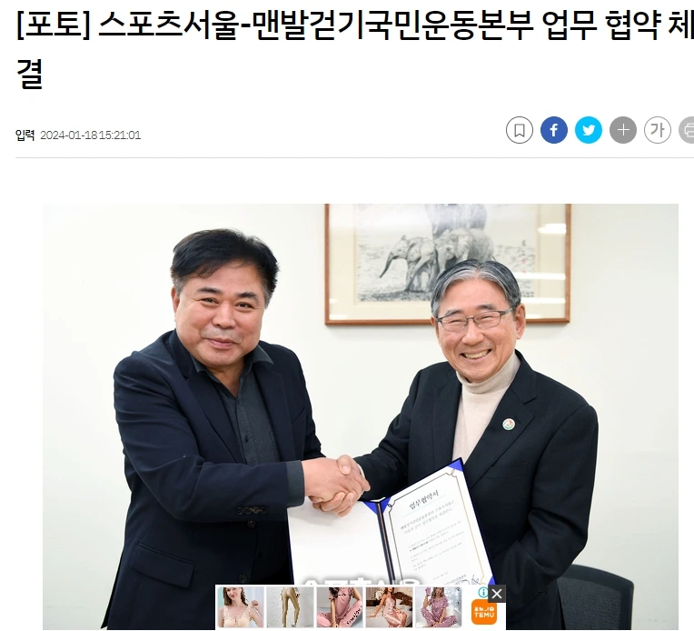 스포츠서울과 맨발 걷기 국민운동본부가 업무 협약식을 개최했다는 소식이다. 스포츠서울 송기윤 대표(왼쪽)와 맨발 걷기 국민운동본부 박동창 회장이 지난 18일 서울 충무로 스포츠서울 본사에서 ‘K-맨발 걷기 페스티벌’(가칭) 공동 개최를 위한 업무협약서에 서명한 후 악수를 하고 있다.